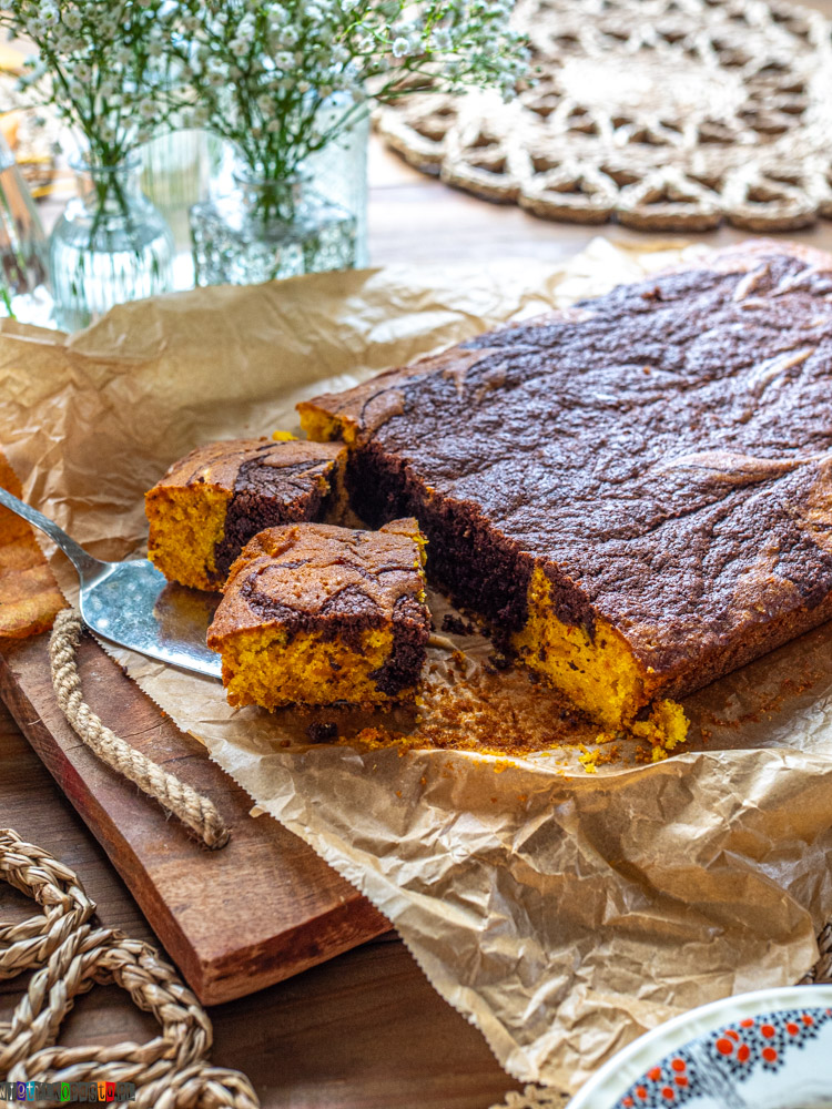 Masło i czekoladę rozpuszcza się w kąpieli wodnej, aż powstanie gładka, lśniąca masa. W osobnej misie ubija się jajka z cukrem i wanilią na puszystą masę, po czym dodaje przesianą mąkę z proszkiem do pieczenia. Puree z dyni miesza się z olejem i cynamonem, a następnie łączy z połową ciasta. Do drugiej połowy dodaje się rozpuszczoną czekoladę. Obie masy układa się naprzemiennie w foremce, tworząc efekt marmurkowy. Ciasto piecze się przez około 40–45 minut, aż patyczek włożony w środek będzie suchy.