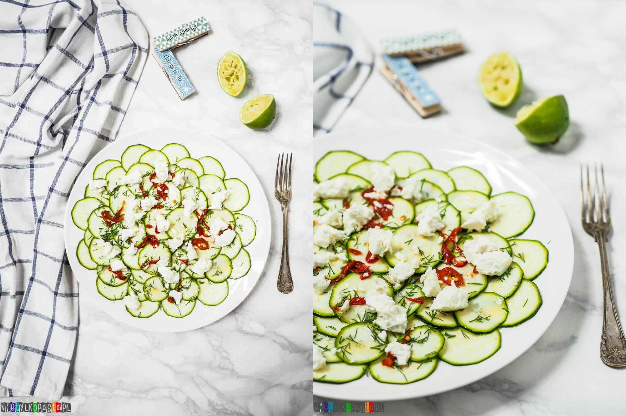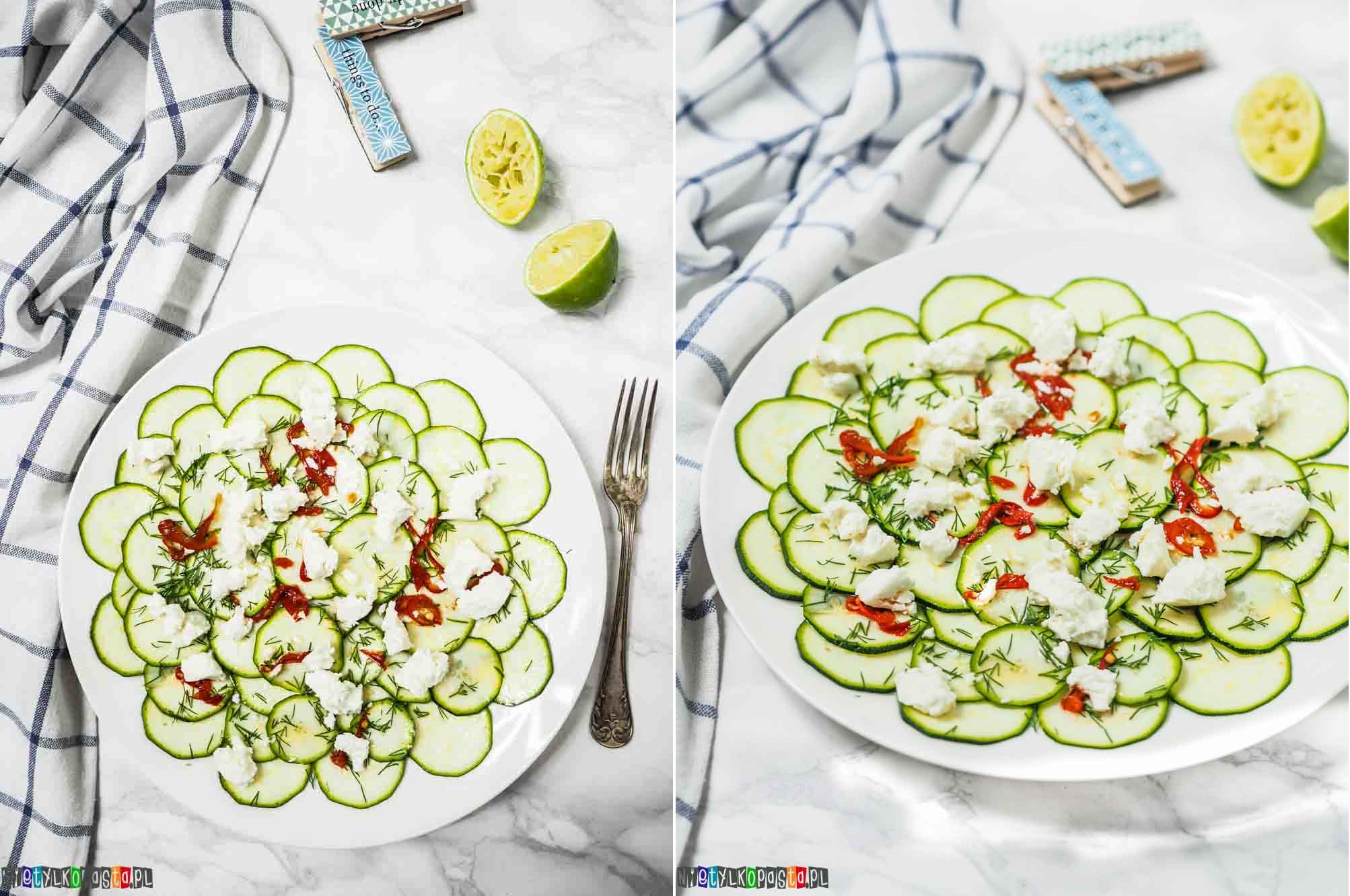 - Cukini臋 pokr贸jcie na bardzo cienkie plasterki i u艂贸偶cie je na talerzu.