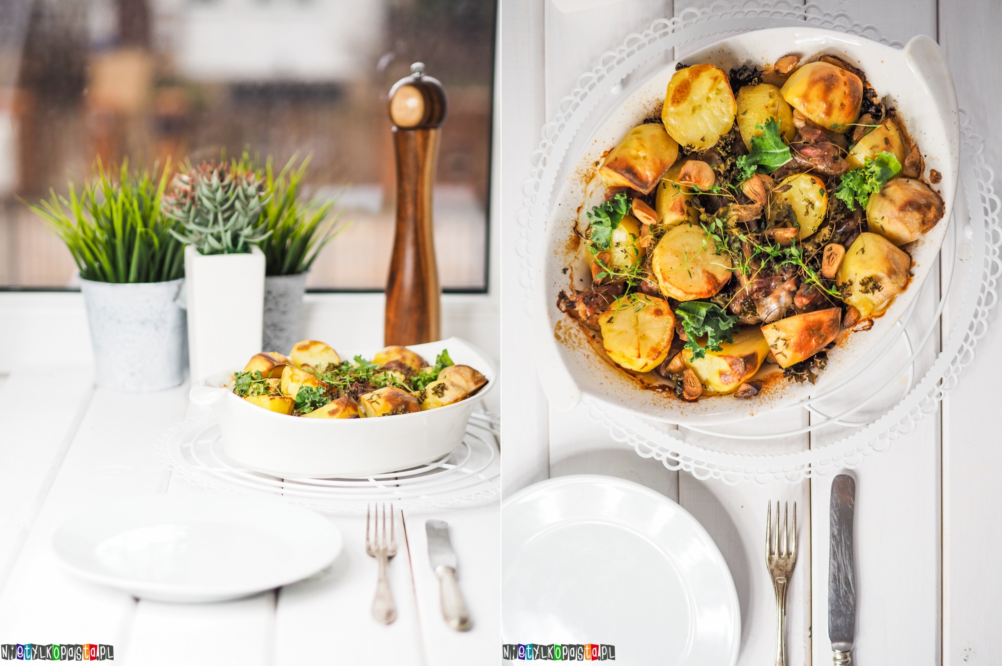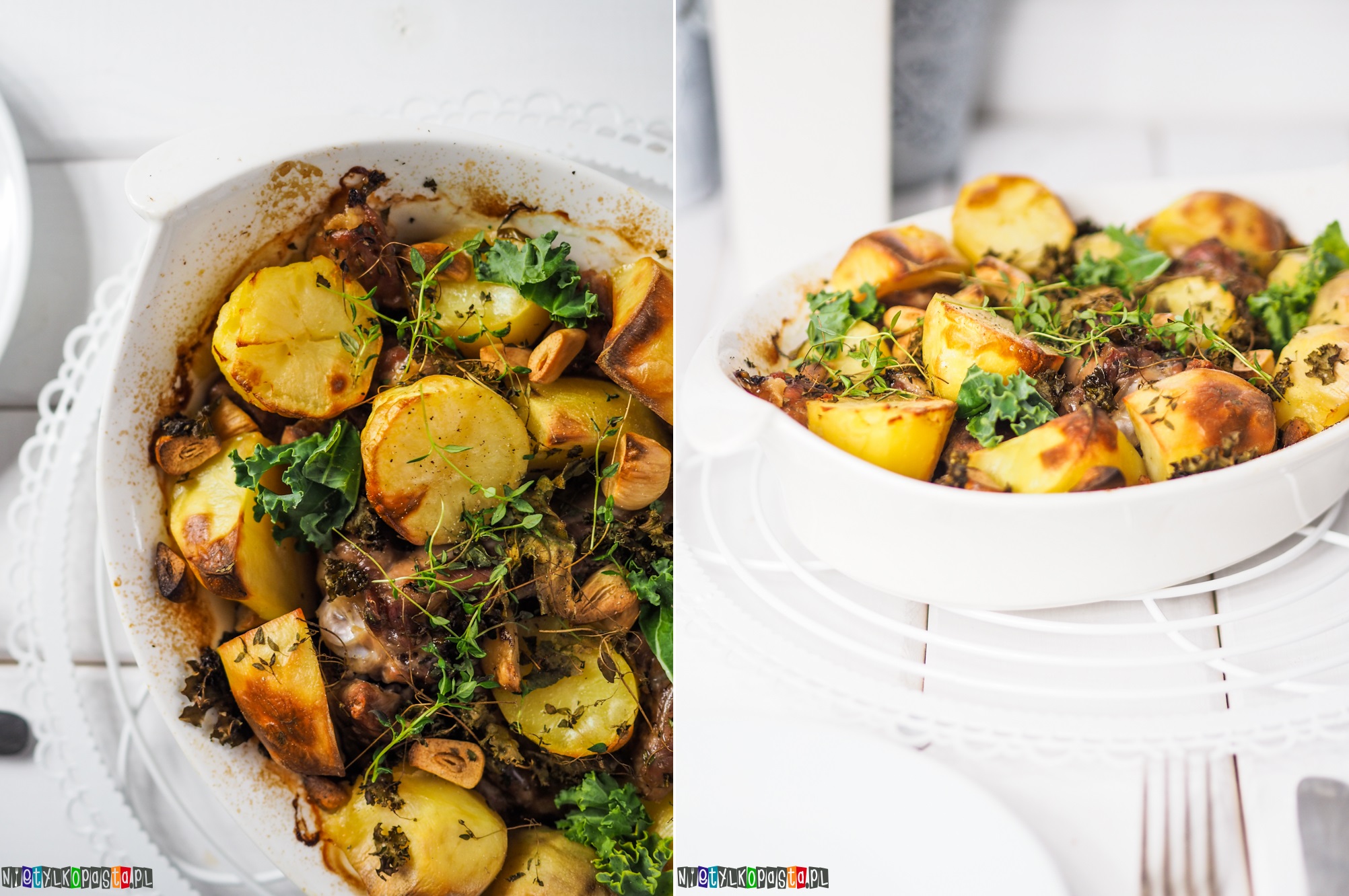 - Czosnek obierzcie. Większe kawałki przekrójcie na pół. Powtykajcie czosnek głębiej, między mięso a ziemniaki. Podobnie zróbcie z liśćmi jarmużu podzielonymi na mniejsze kawałki. Całość doprawcie jeszcze solą i pieprzem, przykryjcie pokrywką lub folią aluminiową i wstawcie do piekarnika nagrzanego do 190 st C (180 st C z termoobiegiem) na 2h. Po tym czasie zdejmijcie folię lub pokrywkę i zapieczcie jeszcze ok 10-15 minut. Na 2-3 minuty przed końcem dodajcie jeszcze odrobinę świeżego jarmużu.