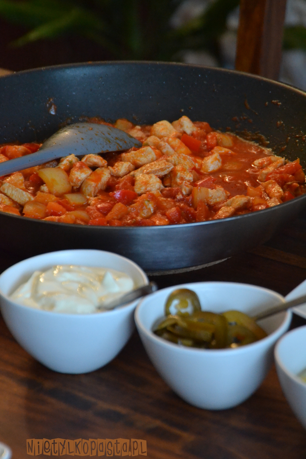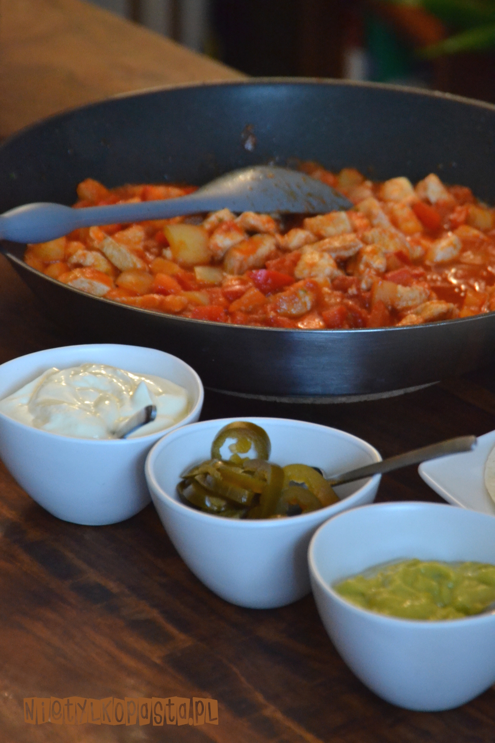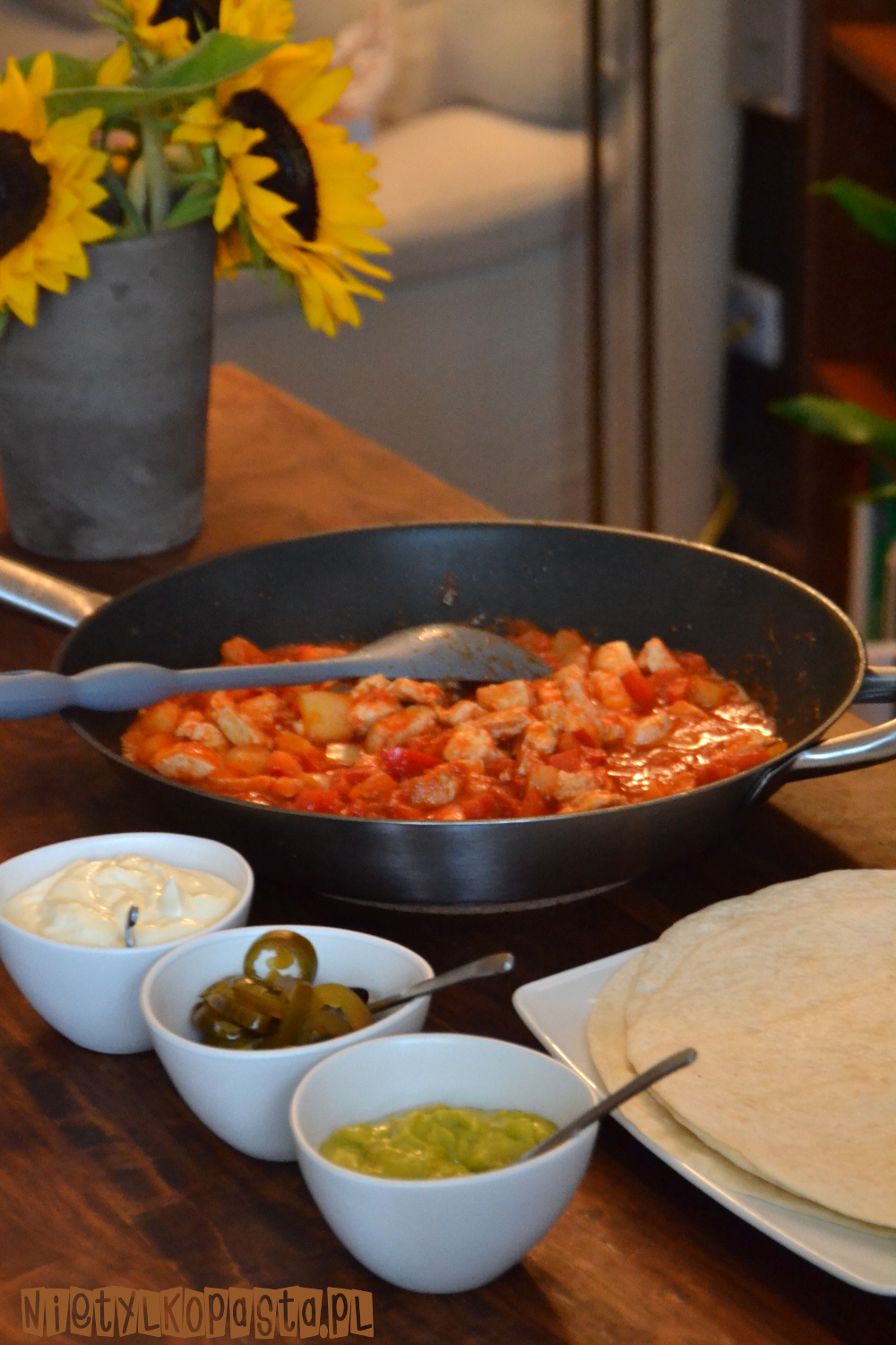 Podawajcie wraz z podgrzanymi tortillami, śmietaną, papryczkami jalapeno i guacamole.