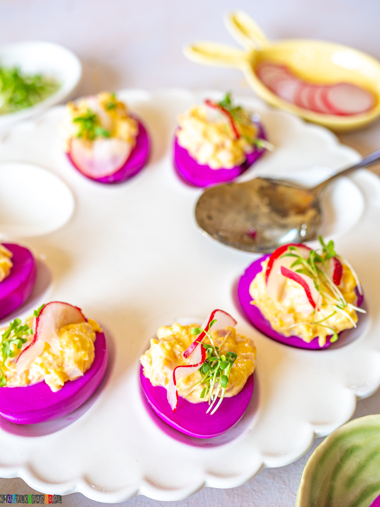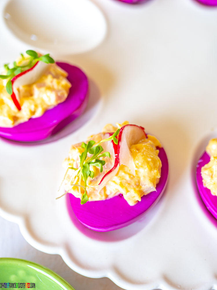 Faszerowane jajka to jedna z tych potraw, które niemal automatycznie kojarzą się z Wielkanocą. Trudno znaleźć świąteczny stół bez jajek w jakiejś formie – czy to z majonezem, czy z chrzanem, czy właśnie faszerowanych. Ta wersja przyciąga uwagę od razu, bo różowy kolor białek robi naprawdę fajne wrażenie i wyróżnia się na tle bardziej klasycznych przekąsek.