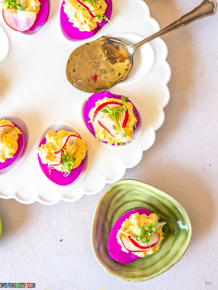 Na wielkanocnym stole takie jajka sprawdzają się idealnie – są efektowne, można je przygotować wcześniej i dobrze pasują do innych świątecznych potraw, jak pieczone mięsa, sałatki czy świeże pieczywo. Różowy kolor z zakwasu buraczanego nie tylko ładnie wygląda, ale też delikatnie podkręca smak, szczególnie jeśli podajesz je z dodatkiem chrzanu.