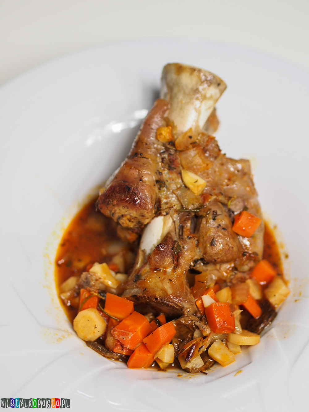 To moment na pokrojenie wszystkich warzyw w kostkę o wielkości ok 1,5 cm. Cebulę pokrójcie w sporą kostkę a czosnek w spore kawałki (2-3 kawałki z jednego ząbka). Z patelni odlejcie tuszcz po smażeniu giczy i dodajcie odrobinę oliwy z oliwek. Na oliwę dodajcie cebulę i czosnek, zeszklijcie je. Następnie dorzućcie wszystkie warzywa i podsmażajcie ok 2-3 minut. Do warzyw dolejcie białe wino i smażcie aż wino zredukuje swoją objętość o nawet połowę. Wtedy dodajcie pomidory z puszki a następnie doprawcie do smaku – solą, pieprzem, odrobiną pieprzu cayenne, oregano i świeżym rozmarynem. Tak przygotowanym sosem polejcie gicze. Piekarnik nagrzejcie do 190 st C, wstawcie gicze w żaroodporny naczyniu z przykrywką (jeśli jej ie macie zróbcie ją z folii aluminiowej, najlepiej dwóch jej warstw). Pieczcie tak przygotowane mięso przez ok 90 minut (do miękkości).