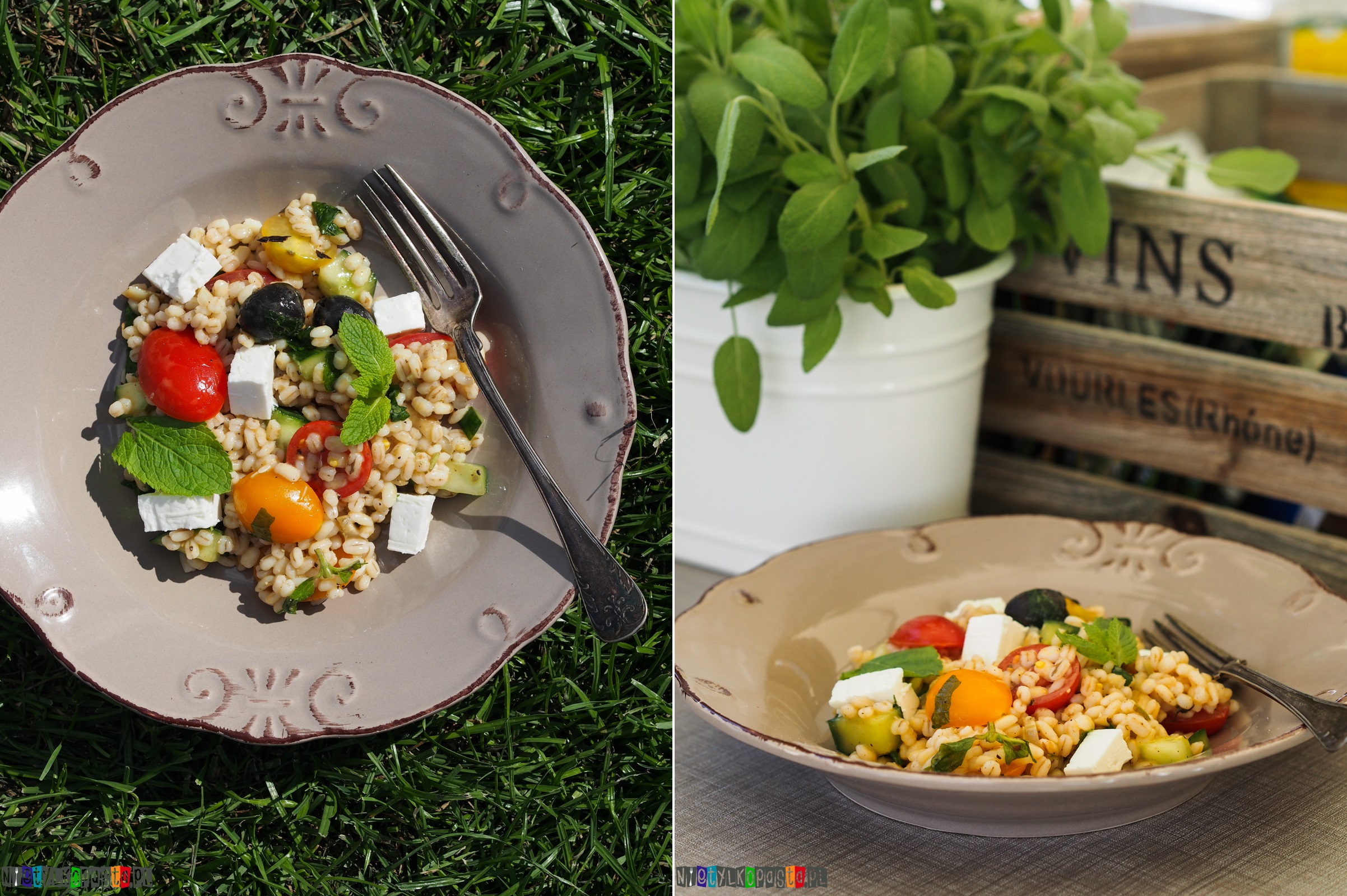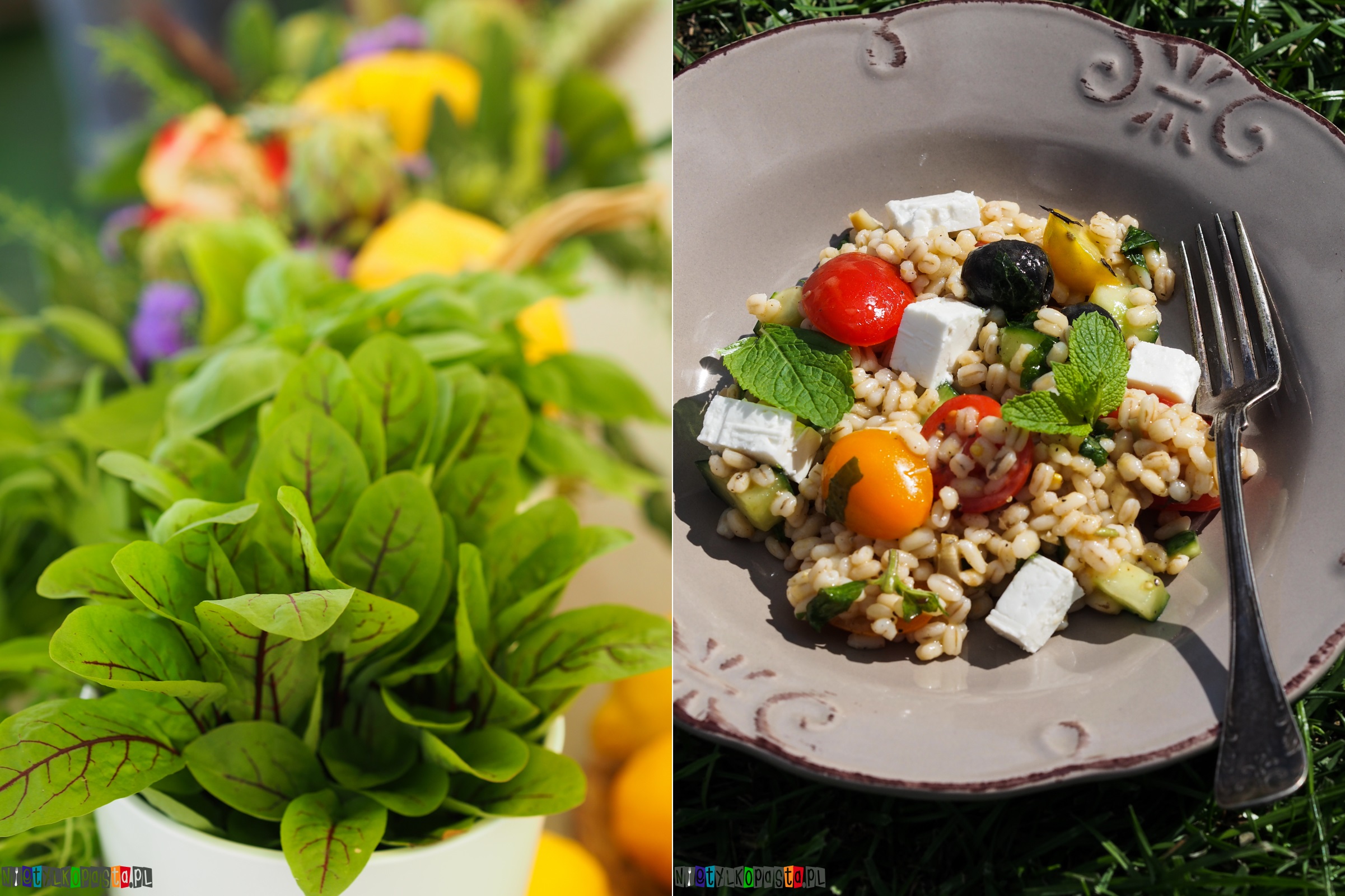 Pęczak ugotujcie na półtwardo i wypłuczcie w zimnej wodzie. Fenkuł (koper włoski) pokrójcie na mniejsze części, posmaruj oliwą i ugrillujcie lub upieczcie w piekarniku. Następnie pokrójcie w kostkę i dodajcie do miski z pęczakiem. Pomidory i ogórki pokrójcie w kostkę i dodajcie do pęczaku. Dodajcie oliwki, rozdrobniony ser, miętę, oliwę i sok z cytryny. Wymieszajcie dokładnie i doprawcie solą i pieprzem. Możecie podać z jogurtem greckim i orzechami piniowymi.