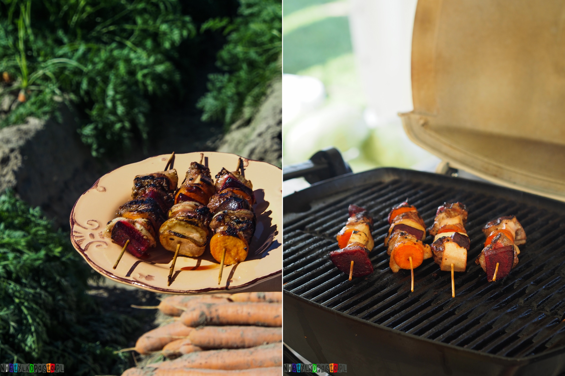 Warzywa umyjcie, jeśli mają w miarę ładną skórkę to nie musicie ich obierać. Pokrójcie wszystkie w kostkę lub w plastry w zależności od warzywa. Boczek pokrójcie w kostkę. Wszystko dodajcie do miski i wsypcie wszystkie przyprawy, które zostały uprzednio zmielone lub utłuczone w moździerzu. Wymieszajcie całość dodając oliwę i sos sojowy. Tak przygotowane składniki należy odstawić na kilka godzin do zamarynowania. Przed grillowaniem nabijcie warzywa i mięso na patyczki szaszłykowe, a następnie grillujcie dość wolno. Warzywa powinny być pół chrupiące.