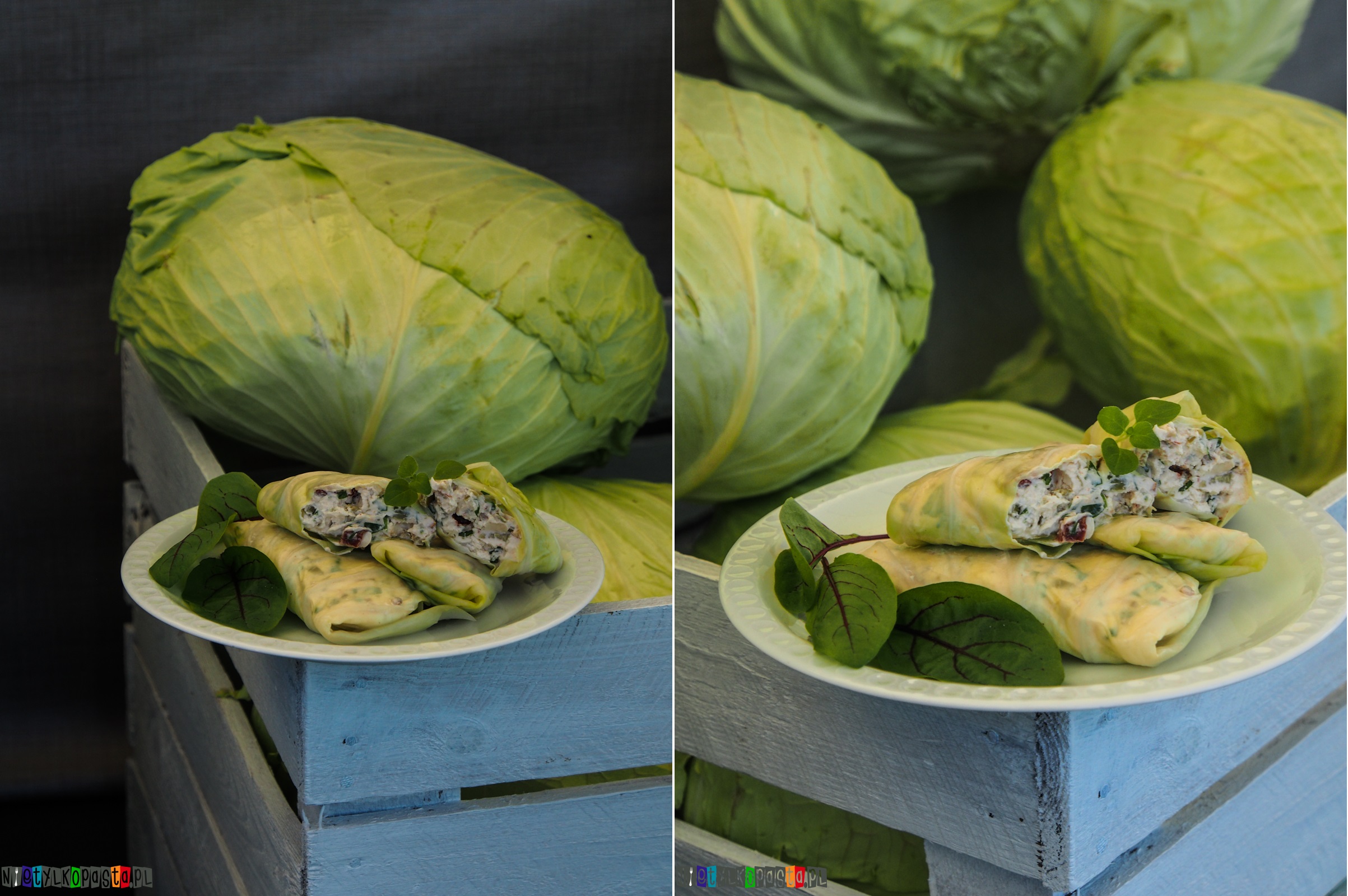 W międzyczasie przygotujcie nadzienie z serka, posiekanych oliwek, posiekanych suszonych pomidorów odsączonych z zalewy i rukoli. Spróbujcie i ewentualnie doprawcie do smaku. W przygotowane liście kapusty zawińcie nadzienie, sposób zawijania jest identyczny jak przy wrapach czy gołąbkach. Podawajcie od razu lub po schłodzeniu coolwrapów w lodówce.