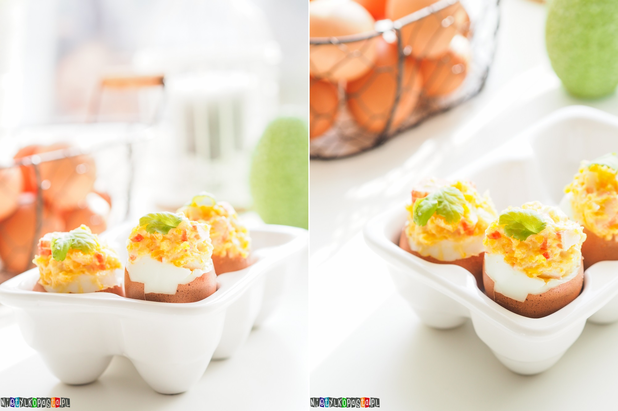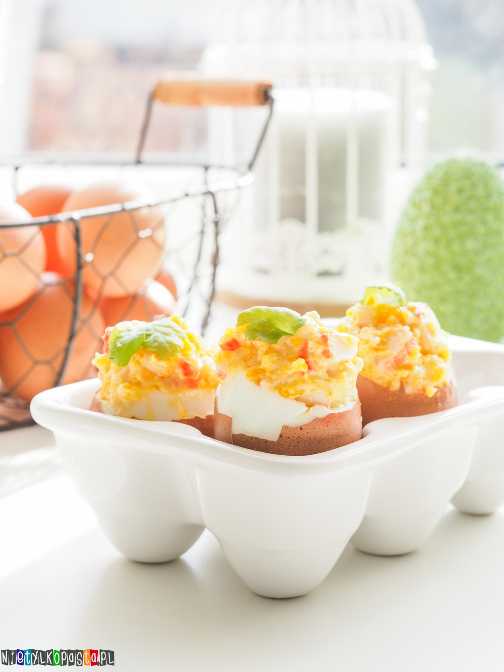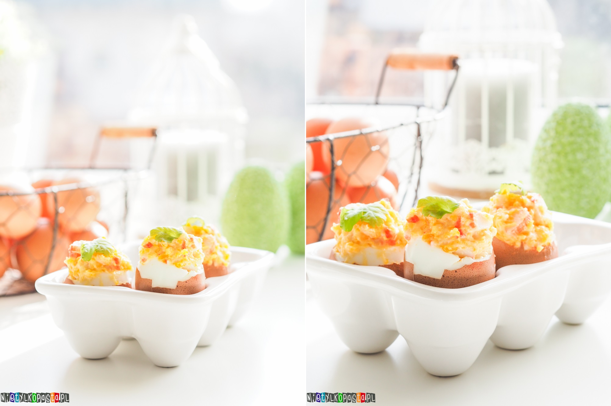 Nie mogę zostawić Was na Wielkanoc bez najlepszych przepisów. W ubiegłym tygodniu pojawi się już na blogu i moim nowym kanale na YouTube przepis na jajka faszerowane mango i kozim serem. Dziś produkcja zrobiona tego samego dnia, ale jaja są zupełnie inne. Przede wszystkim do ich nadziania wykorzystałam łatwo dostępne paluszki krabowe, ale możecie zamienić je i wykorzystać do tego krewetki. Zwróćcie też uwagę na sposób nadziewania jajek. Zdecydowałam się na pionową formę i pozostawienie skorupki. Jeśli macie ładne naczynie na jajka lub chcecie przygotować takie z opakowania po jajkach, ten sposób podania sprawdzi się i u Was.