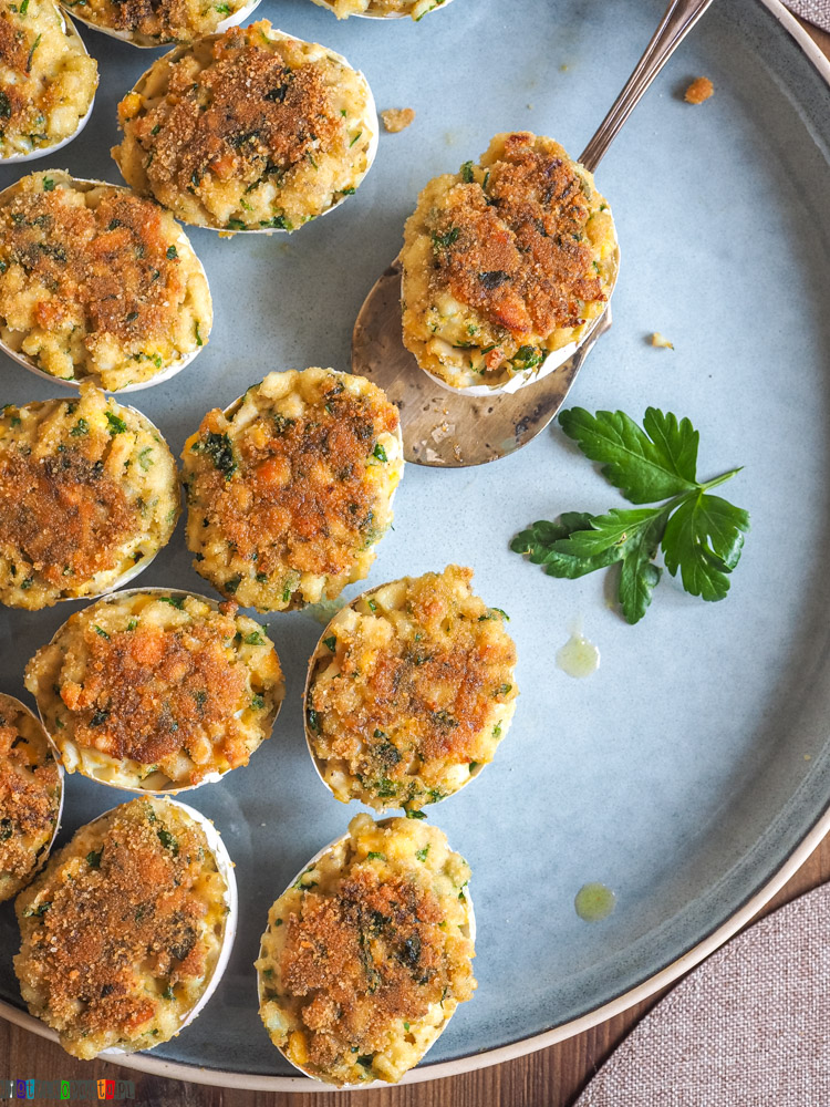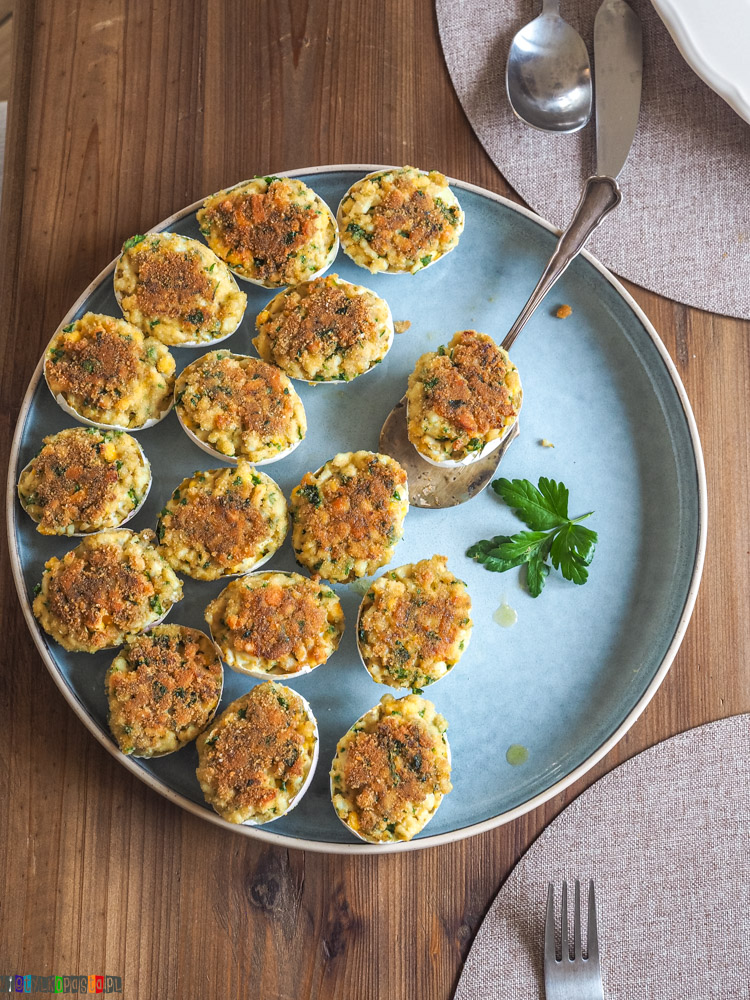 W tej wersji farsz jest prosty i bardzo „domowy” – jajka, podsmażona cebula, namoczona bułka i natka pietruszki tworzą klasyczne połączenie smaków. Dodatkowe jajko skleja masę, dzięki czemu można ją łatwo nałożyć do skorupek i usmażyć. Po podsmażeniu jajka robią się złociste i przyjemnie chrupiące z zewnątrz, a w środku pozostają miękkie.