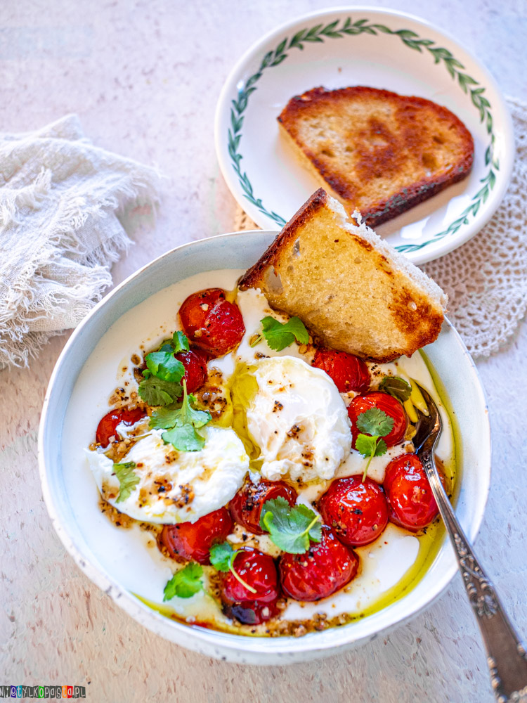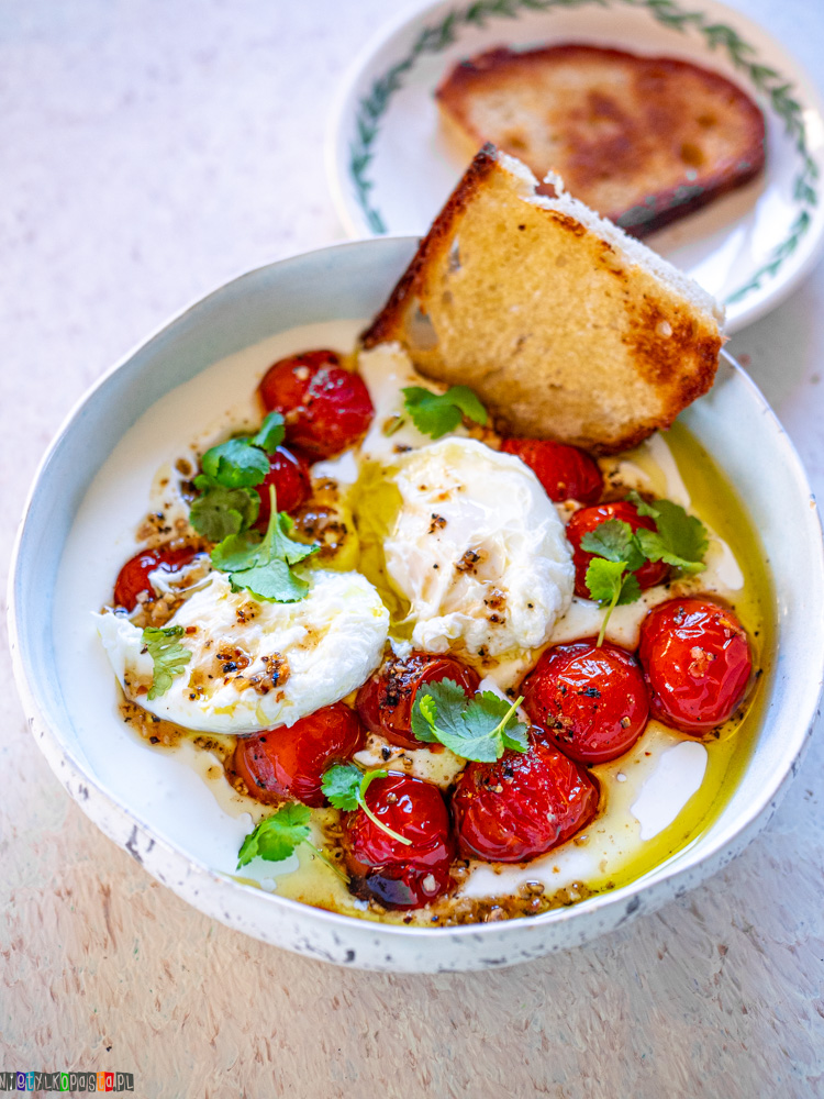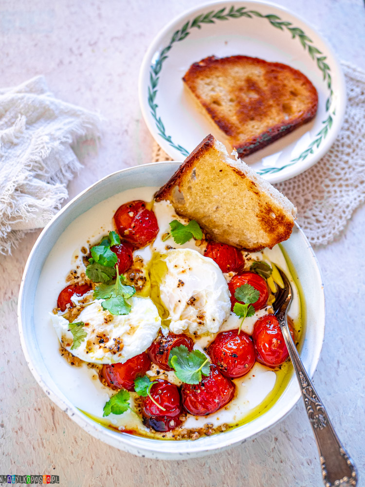 - Do miseczek włóż przygotowany jogurt z fetą, na to połóż dwa jajka, pomidorki upieczone w oliwie ii wszystko polej oliwą z pomidorków z przyprawami. Dodaj listki bazylii lub kolendry, pieczywo i podawaj.