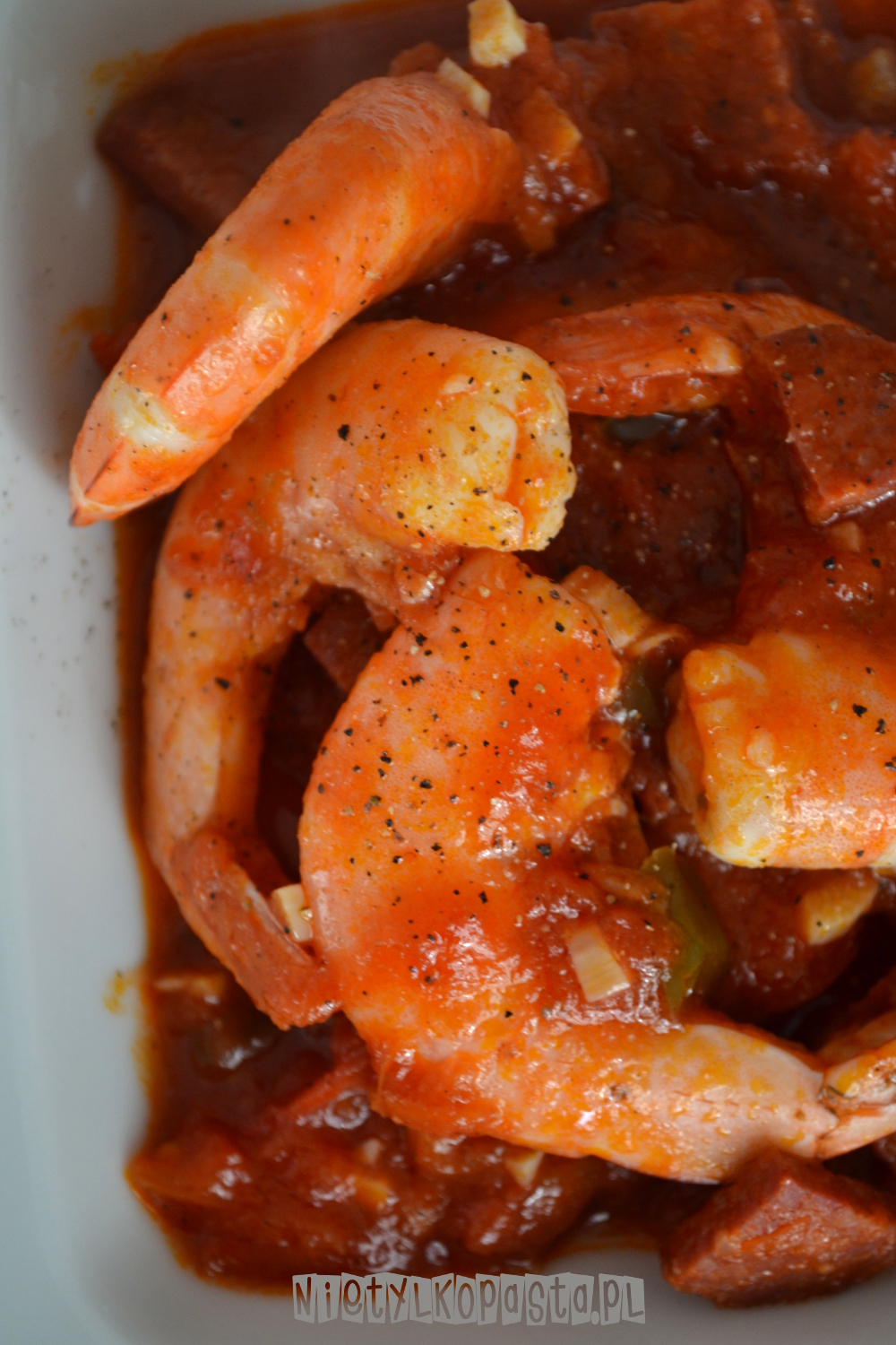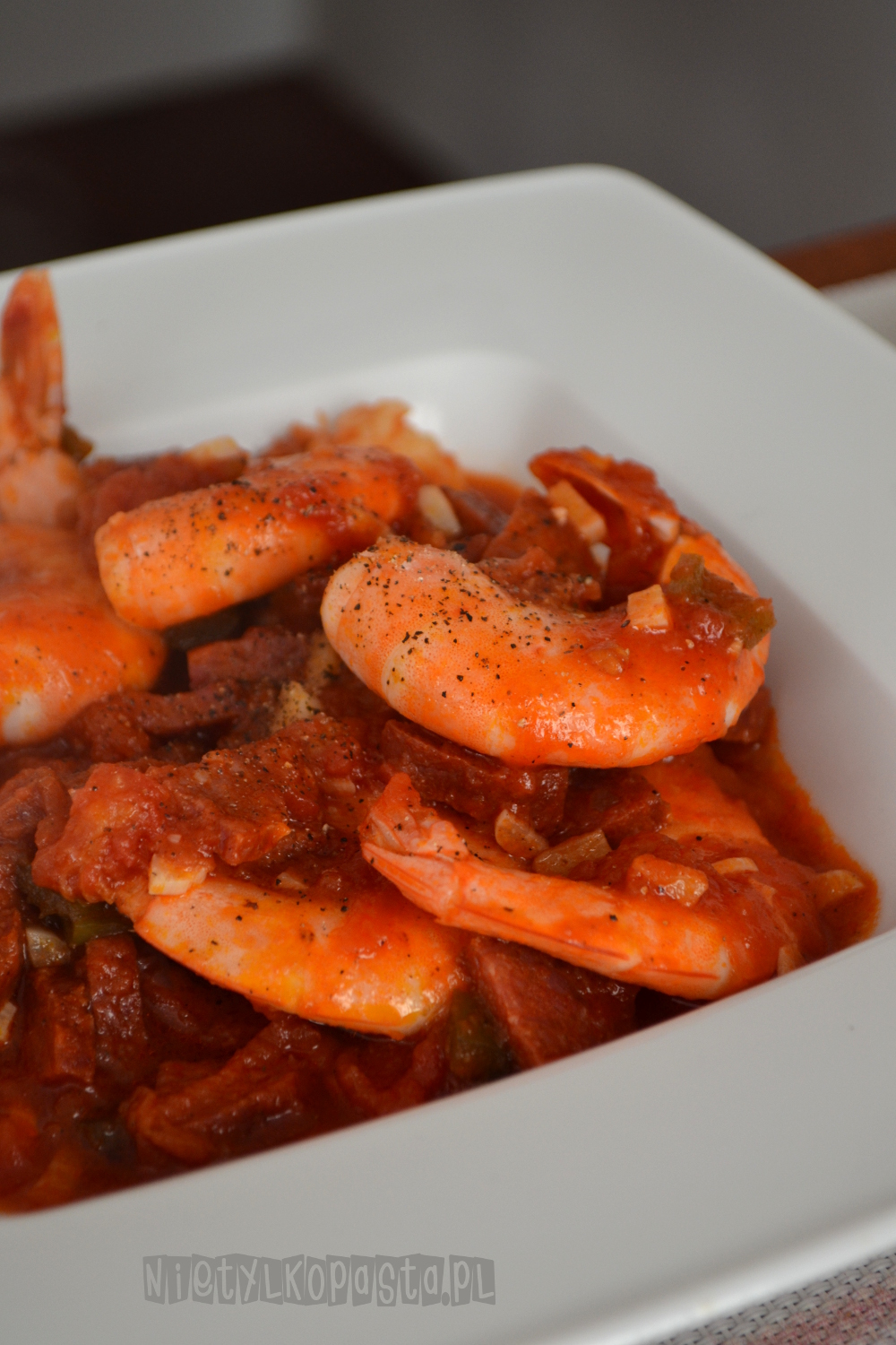 Na oliwie krótko podsmażamy czosnek i papryczkę. Dodajemy krewetki, choriso, pomidory i wino. Dusimy bez przykrycia, aby sos mógł odparować. Doprawiamy odrobiną soli i świeżo mielonego pieprzu.