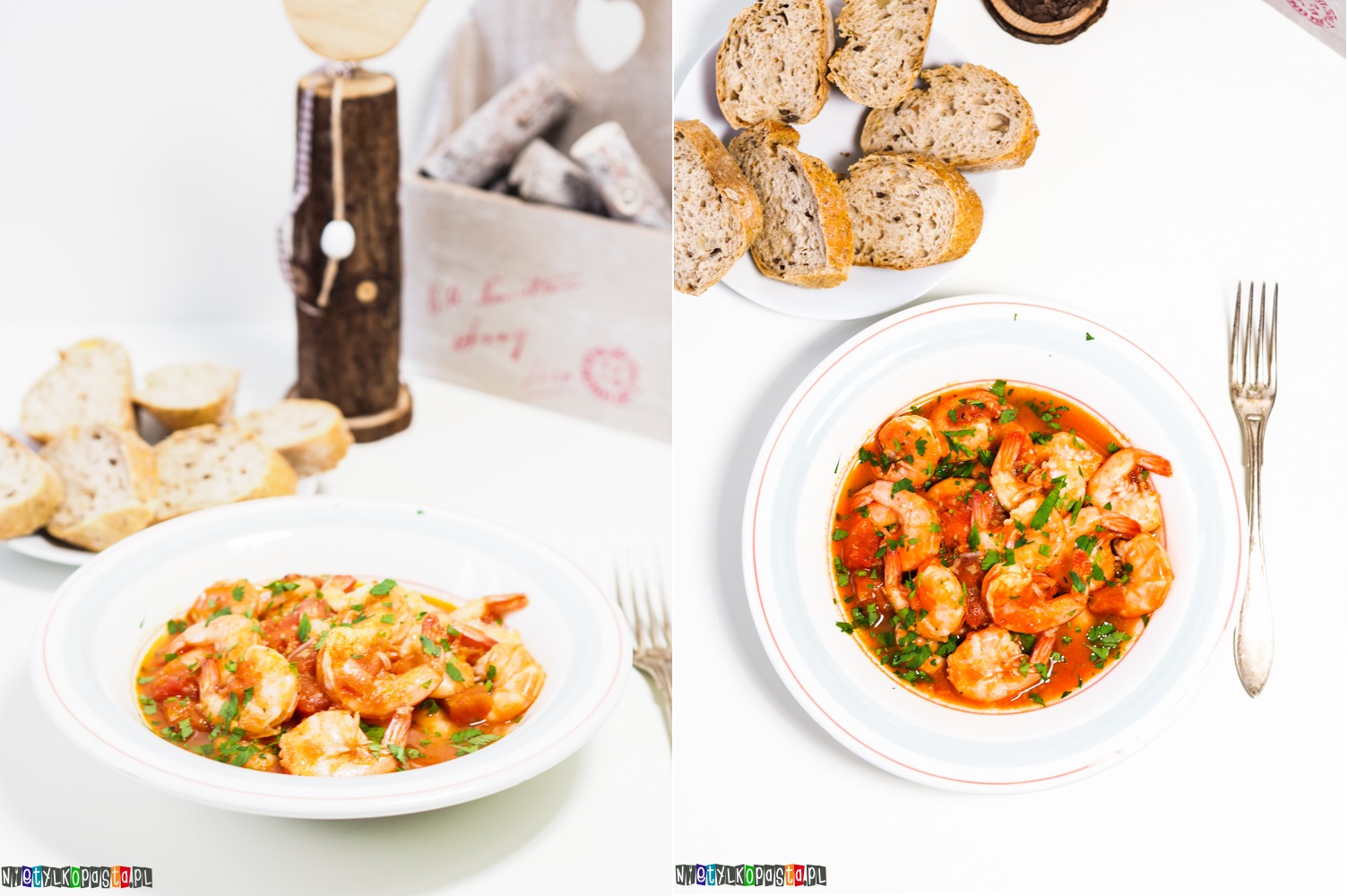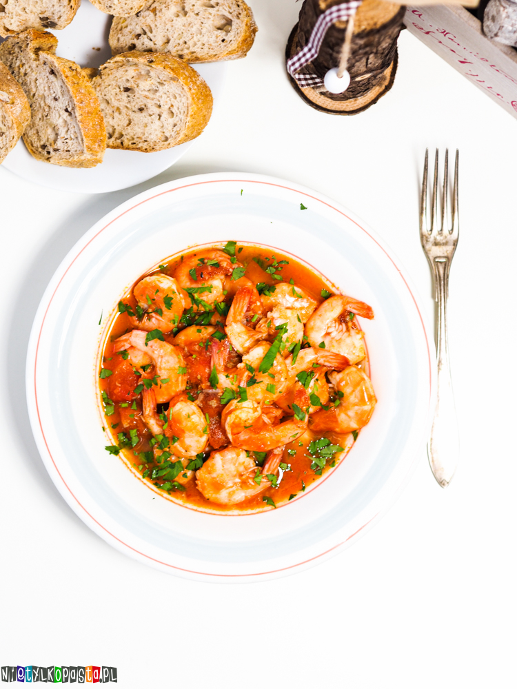 Przepis pyszny i prosty, a dodatek alkoholu ciekawie podkręca smak. Nie obawiajcie się procentów, uciekną one w procesie gotowania. Do przygotowania użyjcie większych krewetek z pancerzykami lub bez. Pamiętajcie jedynie że krewetka w pancerzyku będzie lepsza i bardziej miękka, ale jej obieranie kiedy została przygotowana w sosie pomidorowym może okazać się nieco kłopotliwe.