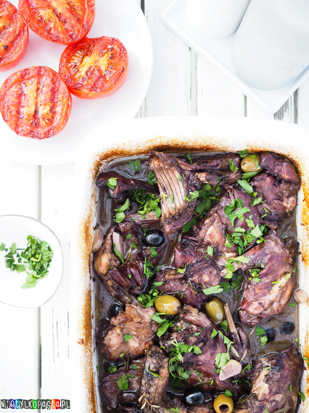 Królik do doskonałe i delikatne mięso, a do tego bardzo proste w przygotowaniu. Polecam ten przepis zarówno na weekendowy obiad jak i Święta, wtedy kiedy chcecie aby na stole pojawiło się coś mniej oczywistego niż „schabowy”. Przepis wymaga czasu ale jest prosty w przygotowaniu i właściwie robi się sam w piekarniku. W tym czasie możecie przygotować pyszne dodatki – u mnie kasza i grillowane pomidory, ale doskonale będzie pasowało do niego tradycyjne puree ziemniaczane, lekkie surówki i inne.