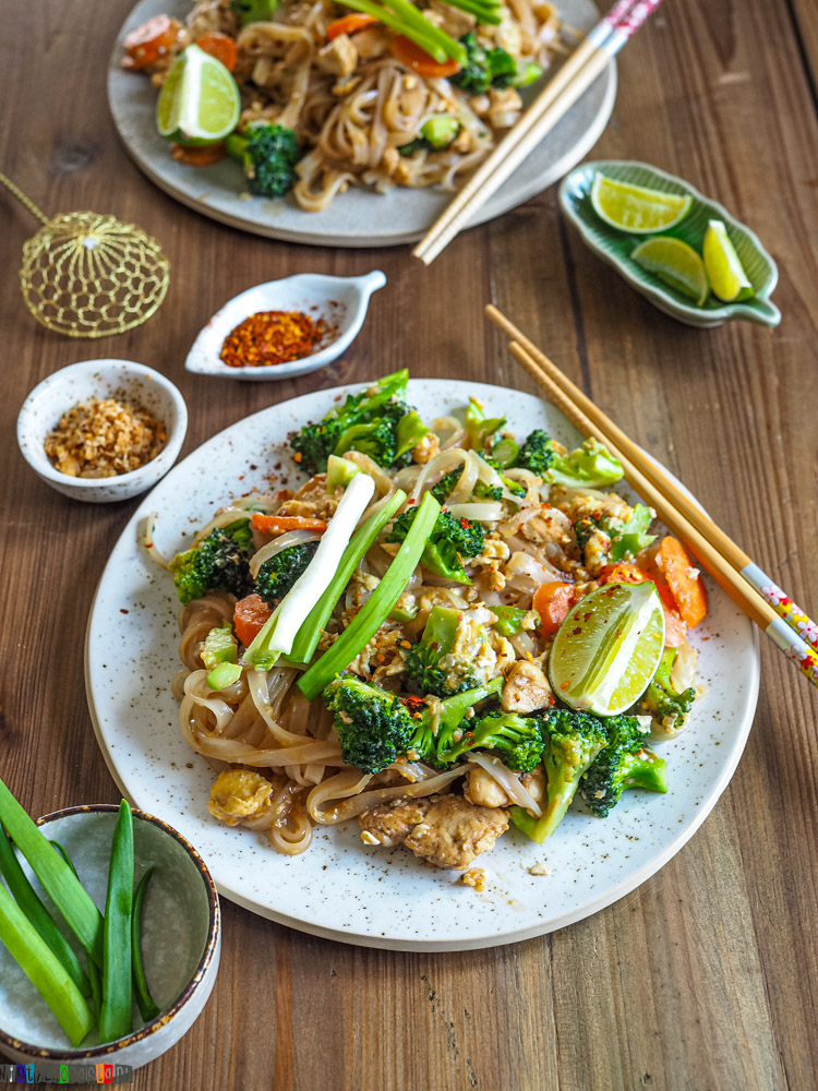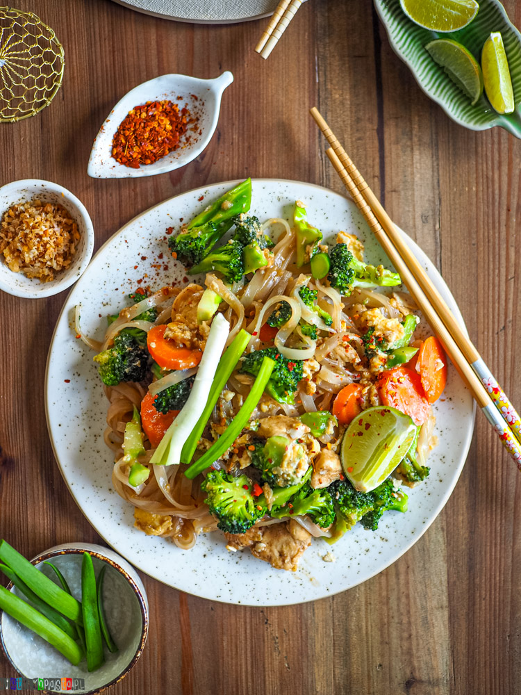 Szeroki makaron ryżowy, kawałki kurczaka, chrupiące warzywa i prosty, wyrazisty sos tworzą razem coś konkretnego, sycącego i naprawdę przyjemnego w smaku. To świetna opcja na obiad po pracy albo kolację, kiedy masz ochotę na coś innego niż klasyczny makaron w sosie pomidorowym.