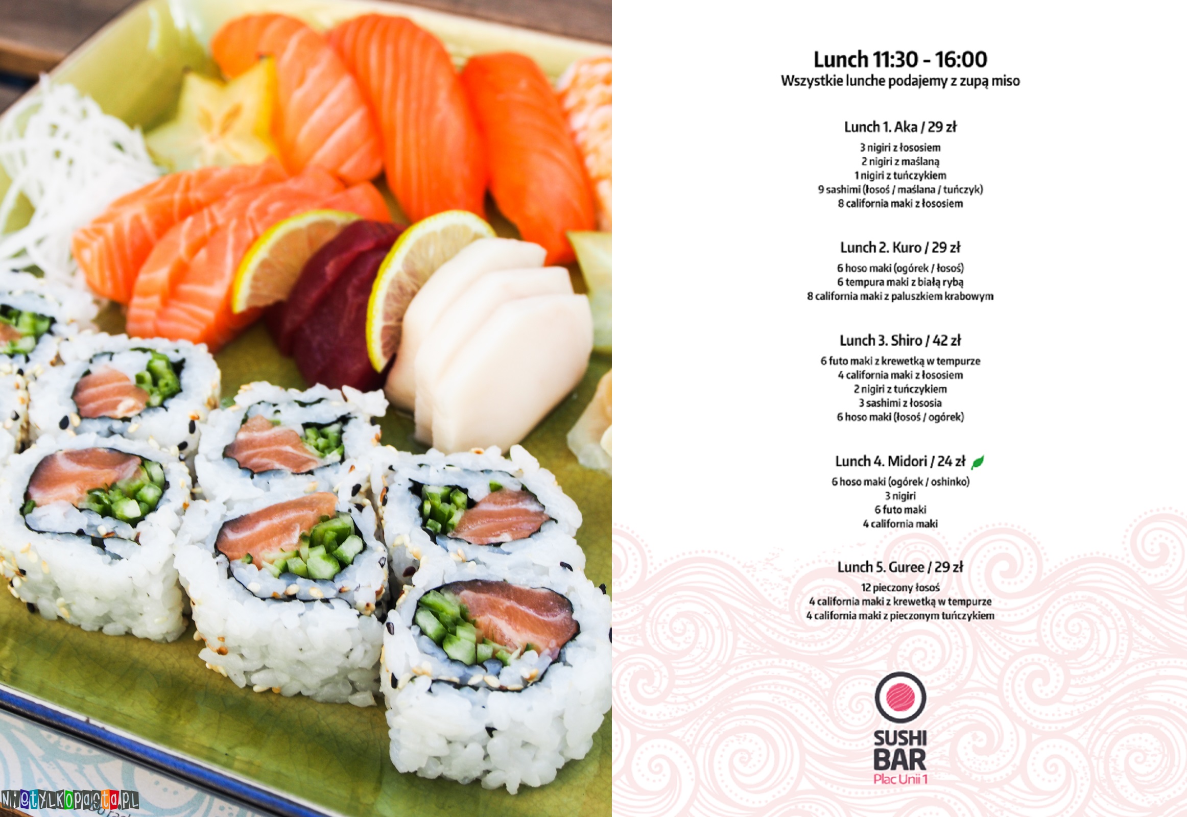 W restauracji znajdziecie standardowe menu sushi, takie z którego możecie sami skomponować swój zestaw lub wybrać zestaw gotowy, również w wersji wegańskiej. W godzinach 11:30 – 16:00 restauracja proponuje fantastyczne zestawy lunchowe w kilku wersjach – dla mnie olbrzymie zaskoczenie pod względem i ilości i ceny. Decydując się na zestaw lunchowy nr 1 otrzymałam pyszną zupę miso oraz talerz pełen maków, nigiri w kilku wersjach i sashimi. Jak dla mnie porcja była przeogromna ale zjadłam prawie wszystko bo było pyszne 🙂 Na koniec miła Pani kelnerka zaproponowała zapakowanie reszty do domu.