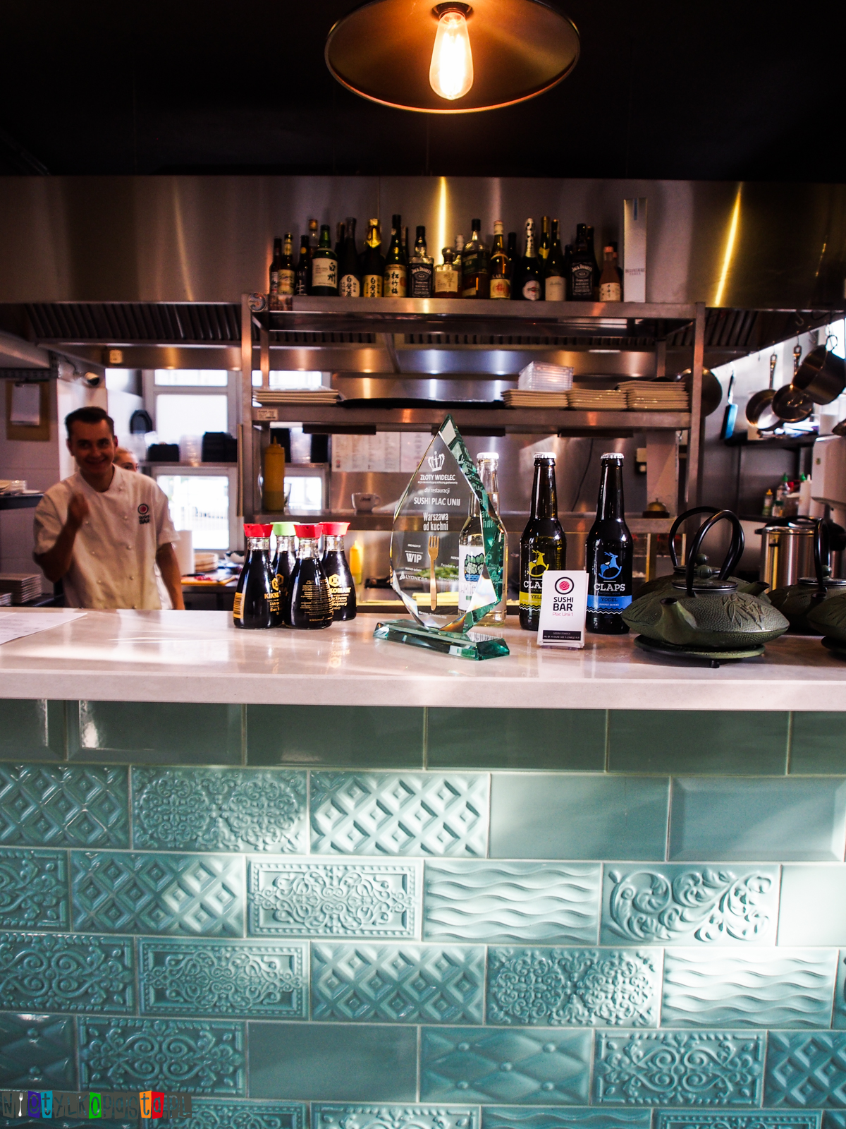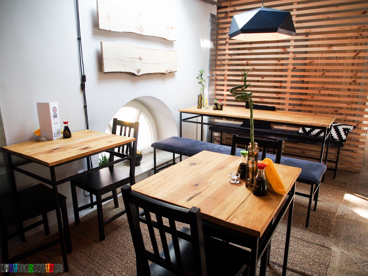 Miałam okazje być w wielu restauracjach i barach sushi. Nie wszędzie wystrój mi tak odpowiada. W tym lokalu nie znajdziecie ciasno upakowanych stolików i ocierających się o siebie krzesełek. Postawiono tu na drewniane stoły oraz długie ławy i krzesła. Drewniane ozdoby i dosłownie kilka kolorów wprowadza do wnętrza dużo ciepła. Restauracja posiada parter i I piętro wypełnione stolikami. Dużą część parteru zajmuje fantastyczna otwarta kuchnia. Możecie do niej zajrzeć i obserwować cały proces przygotowania sushi, ten proces widać także przez jedno z okien kiedy przechodzicie obok restauracji 🙂