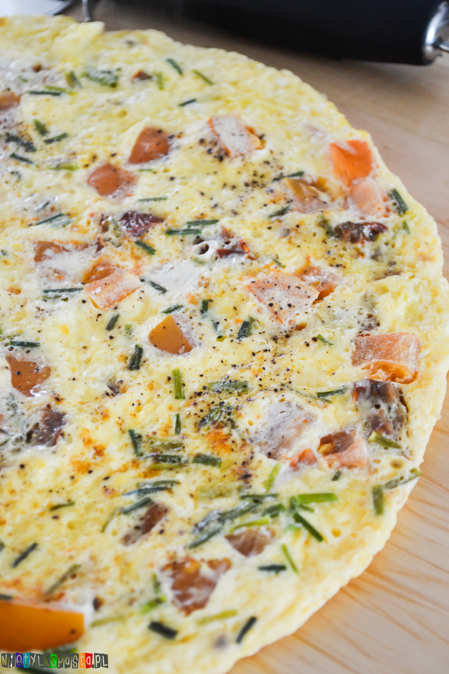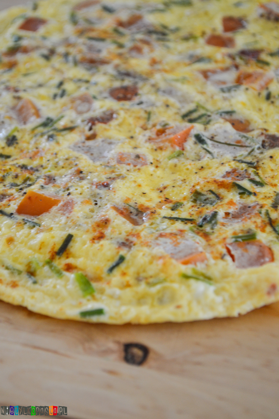 W misce rozmieszajcie jaja razem ze śmietaną. Dodajcie wszystkie pozostałe rozmieszane składniki. Olej i masło podgrzejcie na wyższej patelni. Wlejcie jajka z dodatkami. Omlet należy smażyć pod przykryciem na małym ogniu. Może to zająć 10-12 minut. Możecie złożyć omlet na pół lub pokroić jak pizzę i podawać w postaci trójkątów.
