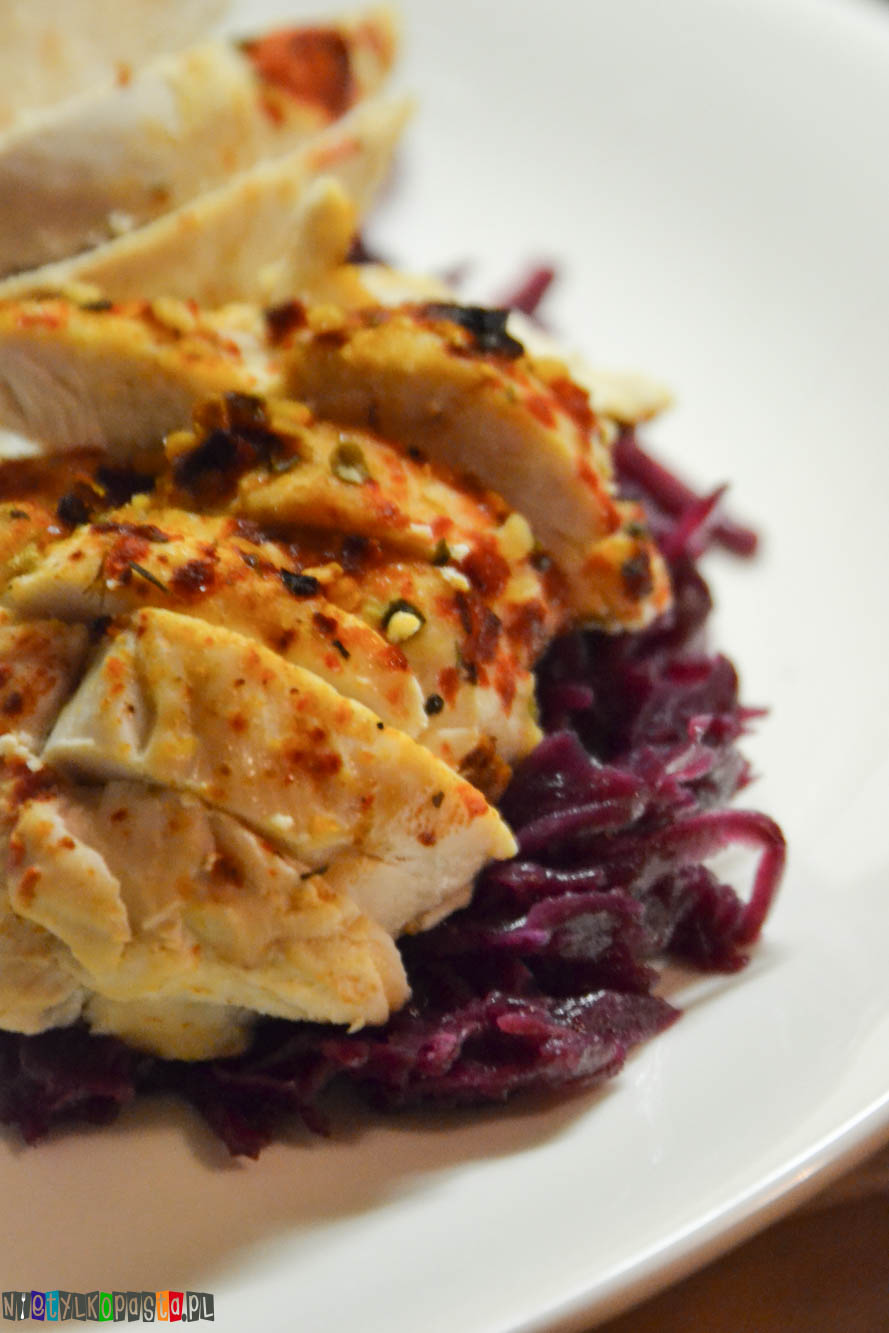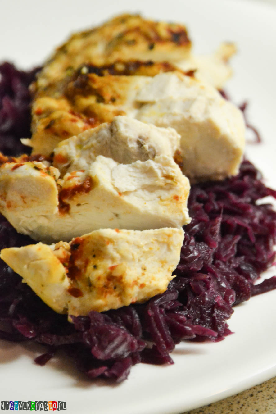 Pokrojoną pierś ułóżcie na kapuście. Możecie podać z kluseczkami lub np pieczonym ziemniakiem.
