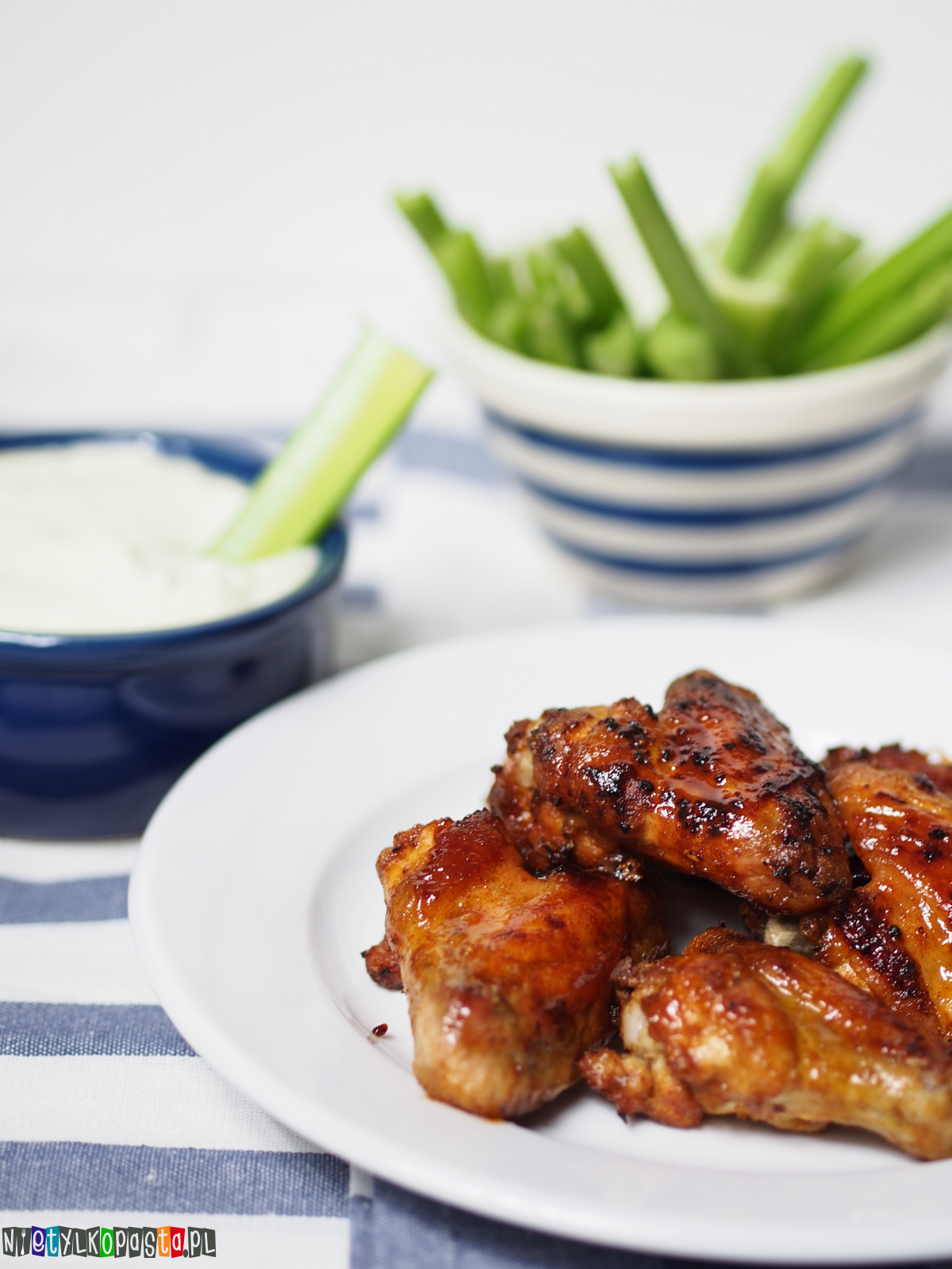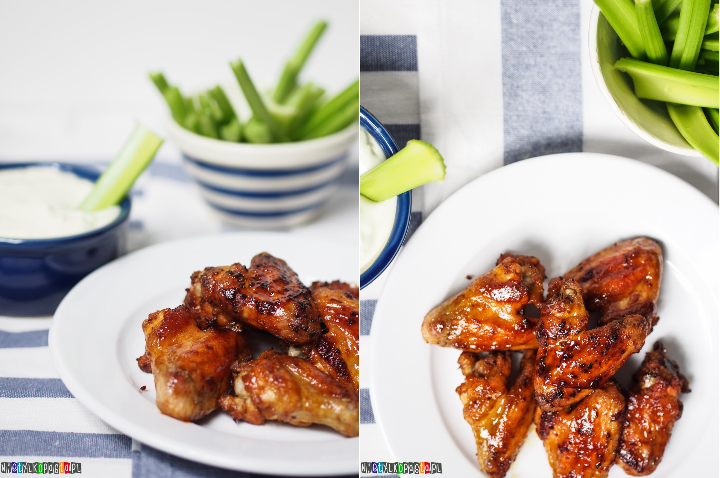 Historia tych skrzydełek sięga dla mnie 2002 roku. W tym właśnie roku w czasie wakacji przez 4 miesiące pracowałam w USA. W miejscowości w której mieszkałam i pracowałam (stan New Jersey), nieopodal znajdował się bar serwujący różne szybkie dania. Zapamiętałam dwa, głównie dlatego że jedliśmy tam chyba tylko te 🙂 Pierwszym z nich jest nachos supreme, czyli nachos podane z chilli con carne i dodatkami – uwielbiam je do tej pory i bardzo często robię. Koniecznie zajrzyjcie po przepis. Drugą potrawą były buffao wings – właśnie takie skrzydełka pieczone z ostrym sosem, podane z selerem naciowym i sosem z dodatkiem sera pleśniowego. Kilka lat temu próbowałam sama odtworzyć ten przepis, ale próby odbiegały od oryginału. Tym razem mam dla Was przepis najbardziej przypominający ten smak z 2002 roku. A przepis dedykuję Izie i Tomkowi, którzy zapewne tak samo jak ja miło wspominają to danie 🙂