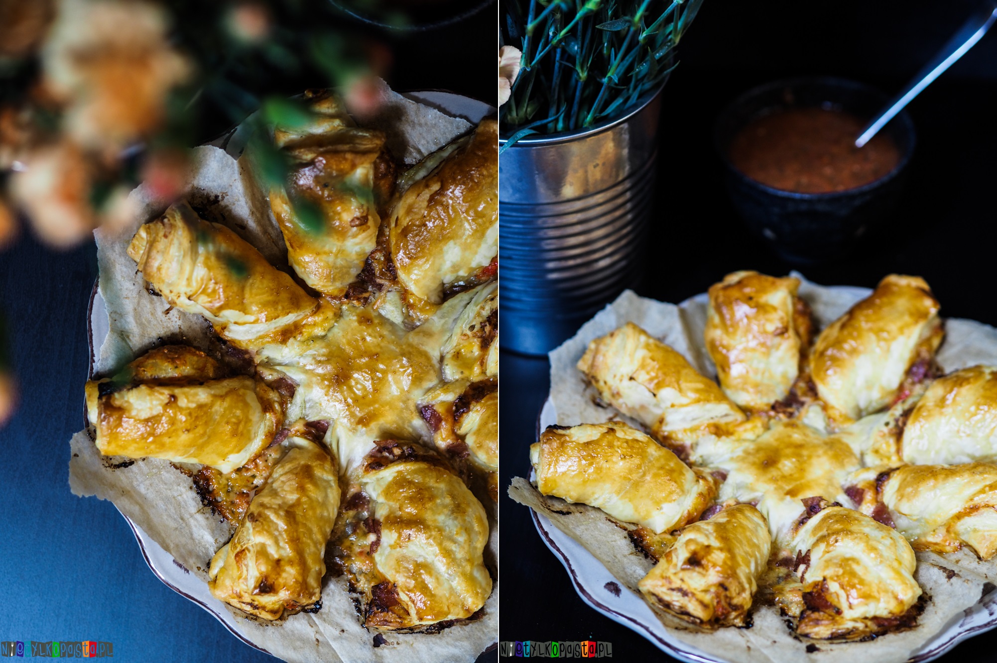 - Ciasto francuskie rozwińcie i wytnijcie z niego dwa równe koła. Pierwsze połóżcie na blachę do pieczenia wyłożoną papierem do pieczenia. Na kole rozsmarujcie sos, posypcie tartym serem, salami pokrojone w mniejsze części i posypcie oregano. Przykryjcie drugim kołem z ciasta. Natnijcie koło i zawińcie zgodnie z tym co pokazuje Wam na filmie na YouTube. Na koniec posmarujcie wszystko rozbełtanym jajkiem za pomocą kuchennego pędzla.