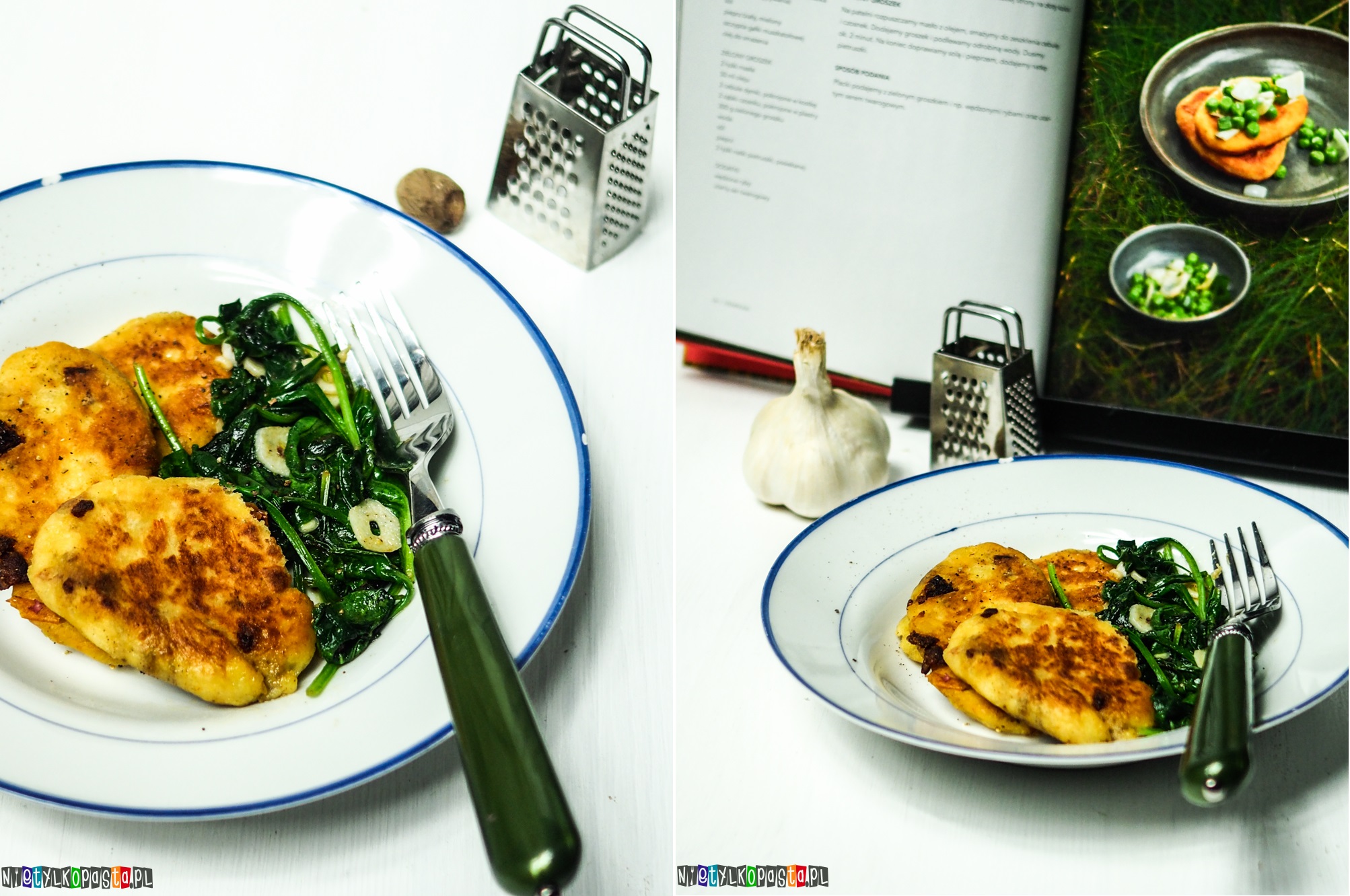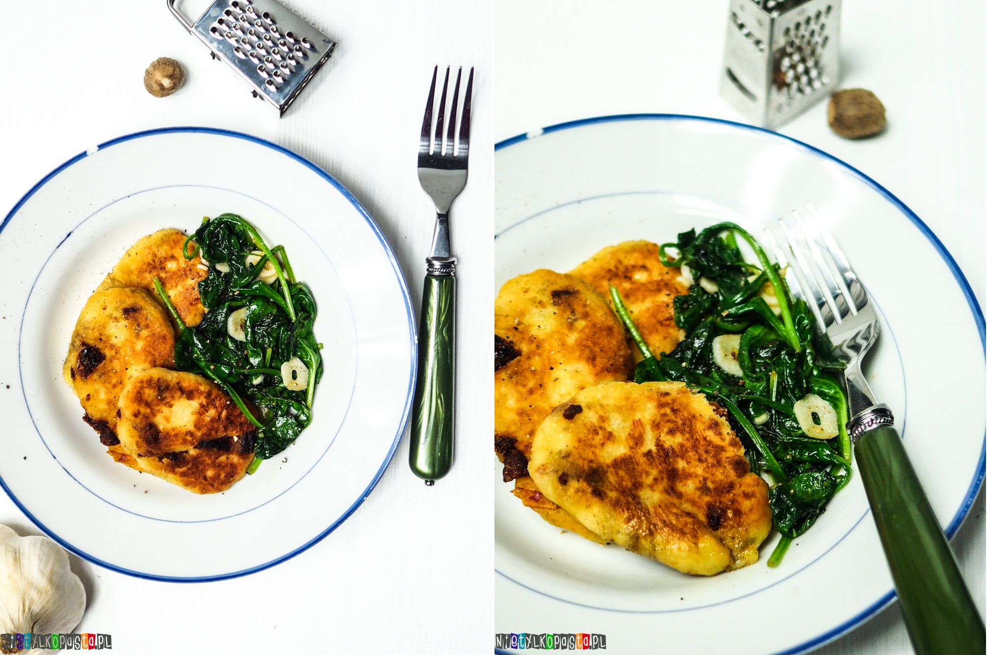 Na drugą patelnię wlejcie odrobinę oliwy i wrzućcie czosnek pokrojony w plasterki. Po 2 min dodajcie szpinak i smażcie ok 1 minuty aż liście zmiękną. Dodajcie odrobinę gałki muszkatołowej i wyłóżcie szpinak na usmażone placuszki.