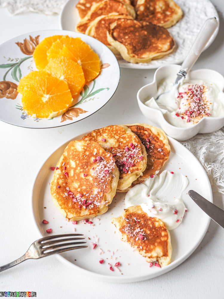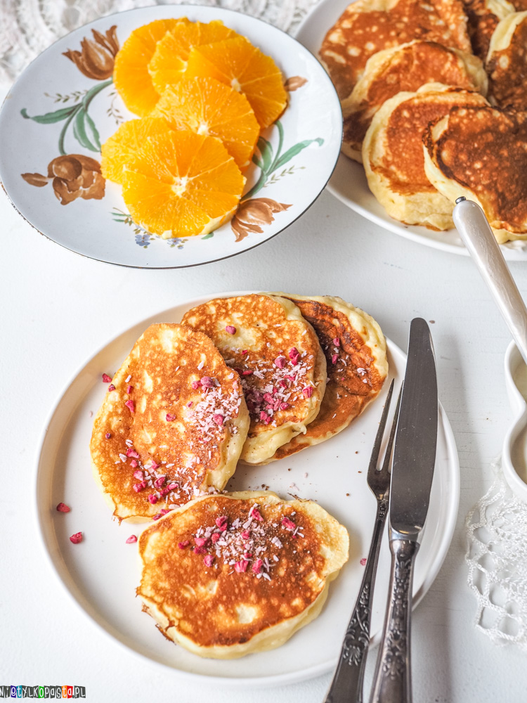 - Usmażone placuszki podawaj z serkiem waniliowym i ulubionymi owocami.