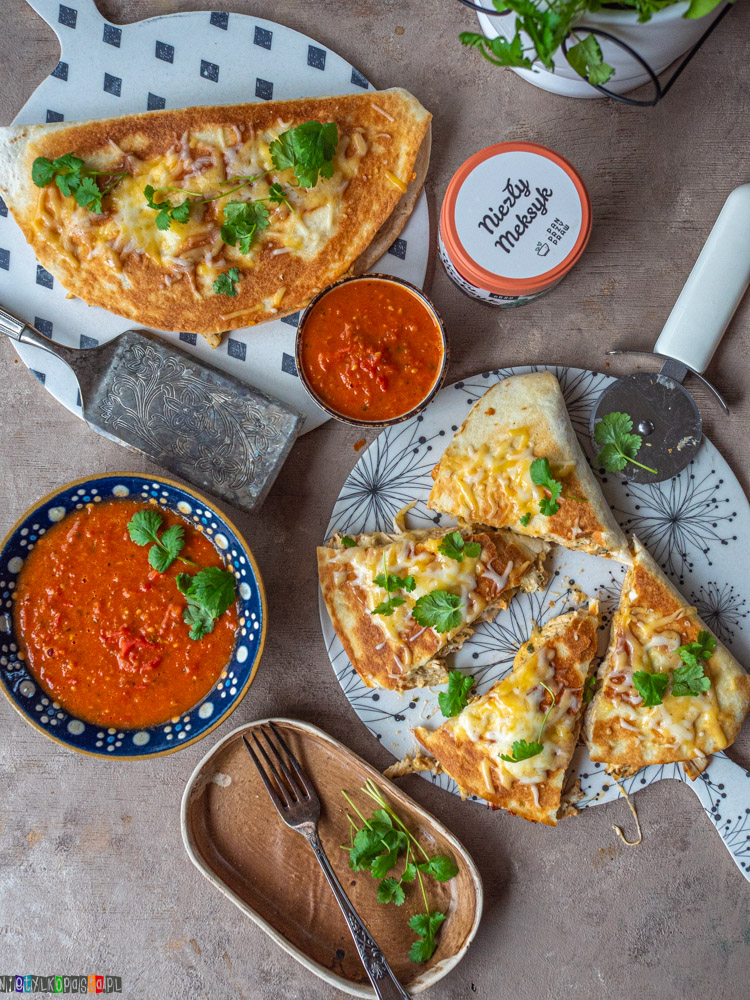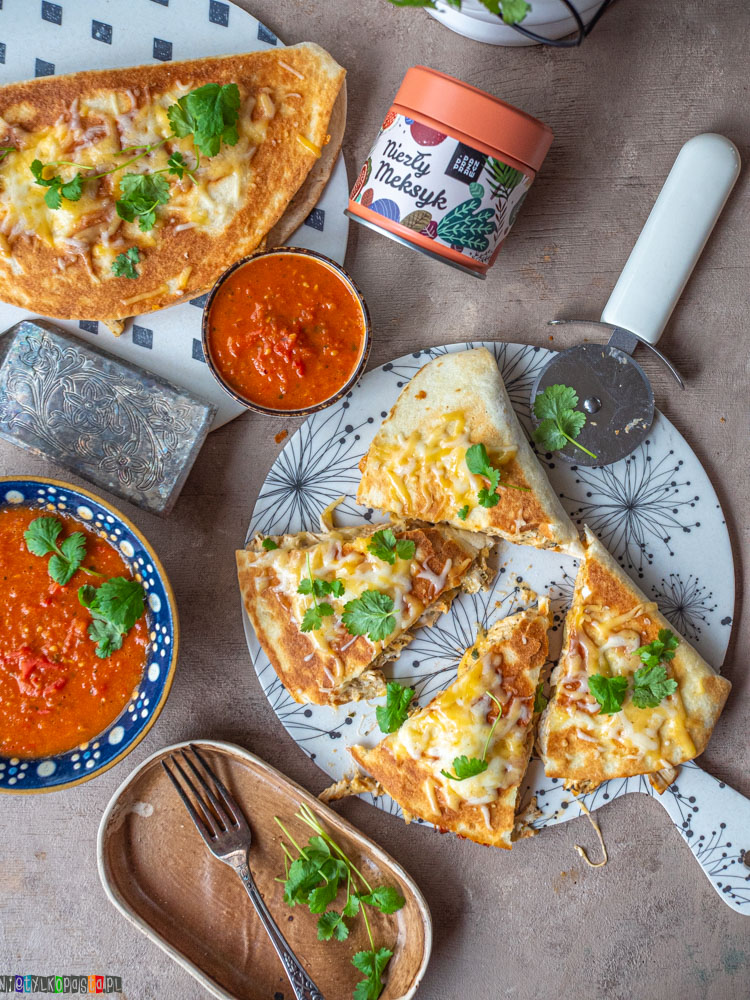 Quesadilla z rwanym kurczakiem to jeden z tych przepisów, które ratują wtedy, gdy masz ochotę na coś konkretnego, serowego i pełnego smaku, ale nie chcesz spędzać w kuchni pół dnia. Chrupiąca tortilla, soczyste mięso, ciągnący się ser i aromatyczny sos pomidorowy tworzą razem danie, które sprawdzi się zarówno na szybki obiad, kolację, jak i luźne spotkanie ze znajomymi. To kuchnia inspirowana Meksykiem w bardzo domowym, prostym wydaniu.