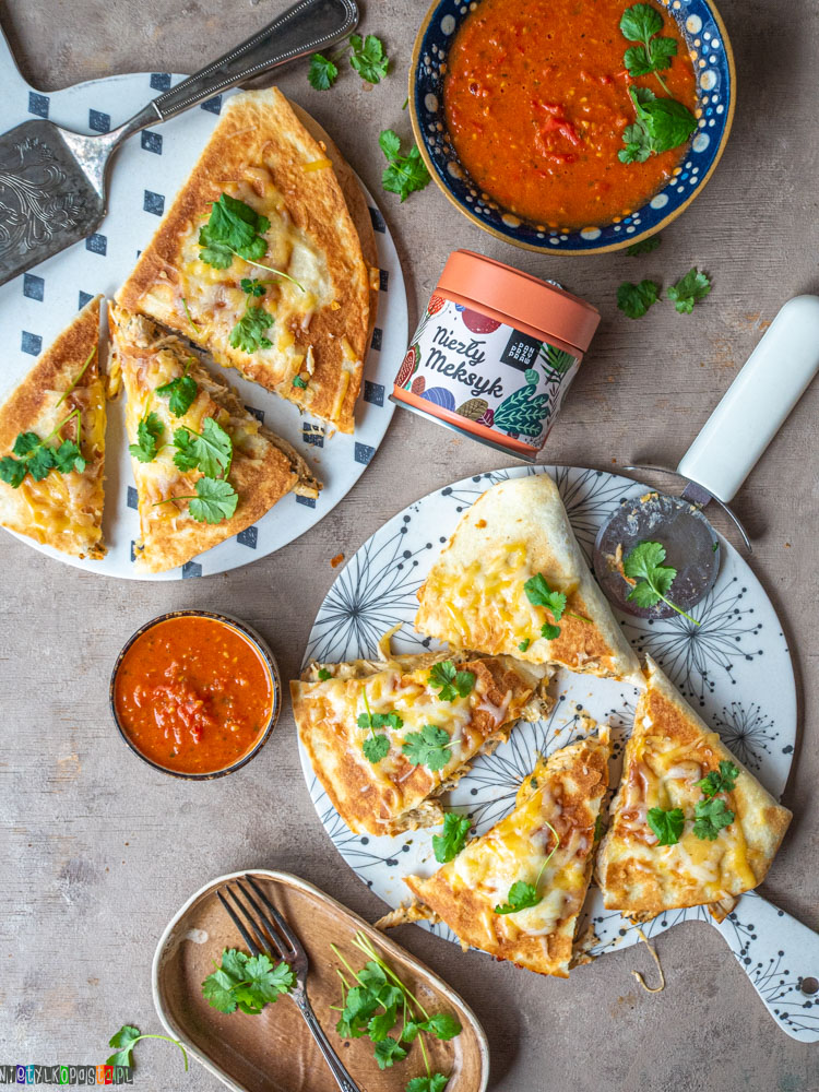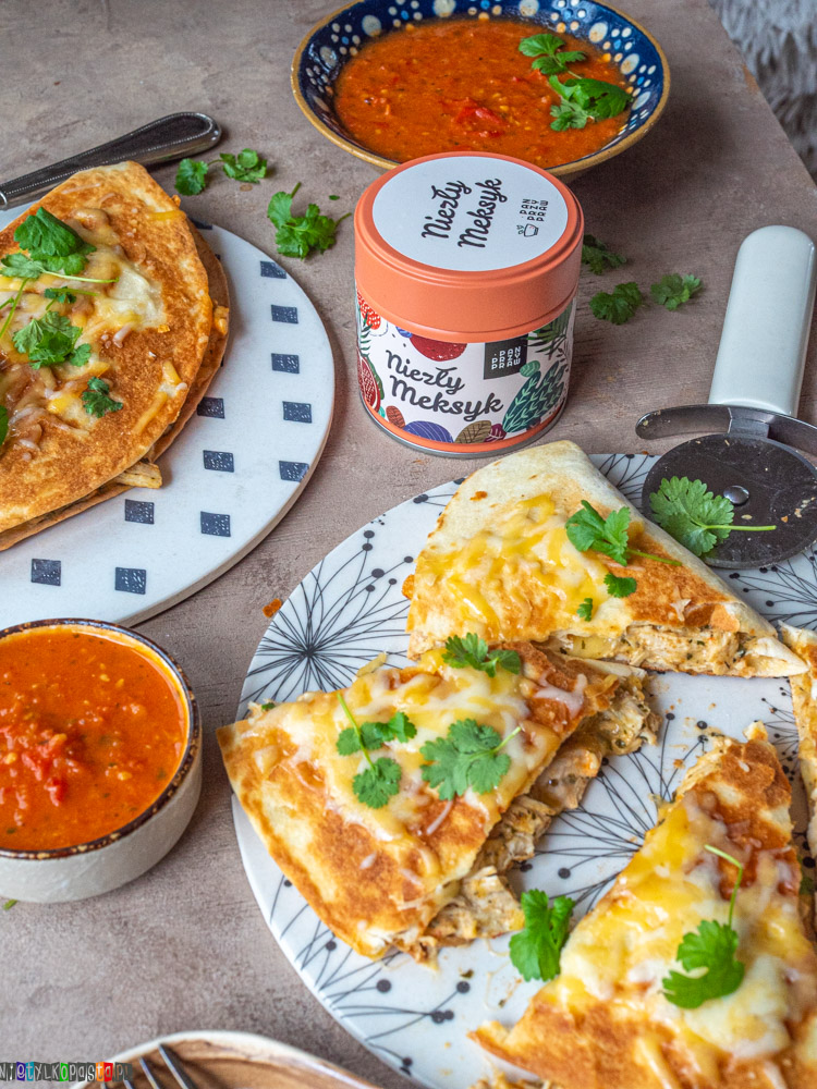 Kluczem do tej quesadilli jest dobrze doprawiony, miękki kurczak, który po usmażeniu łatwo rozpada się na włókna. Dzięki temu nadzienie jest soczyste, lekkie i idealnie łączy się z serem oraz dodatkami. Całość zamknięta w tortilli i podsmażona na patelni daje efekt, który trudno przebić – chrupiąco na zewnątrz, kremowo i aromatycznie w środku. To jedno z tych dań, które znikają z talerza szybciej, niż zdążysz je pokroić.