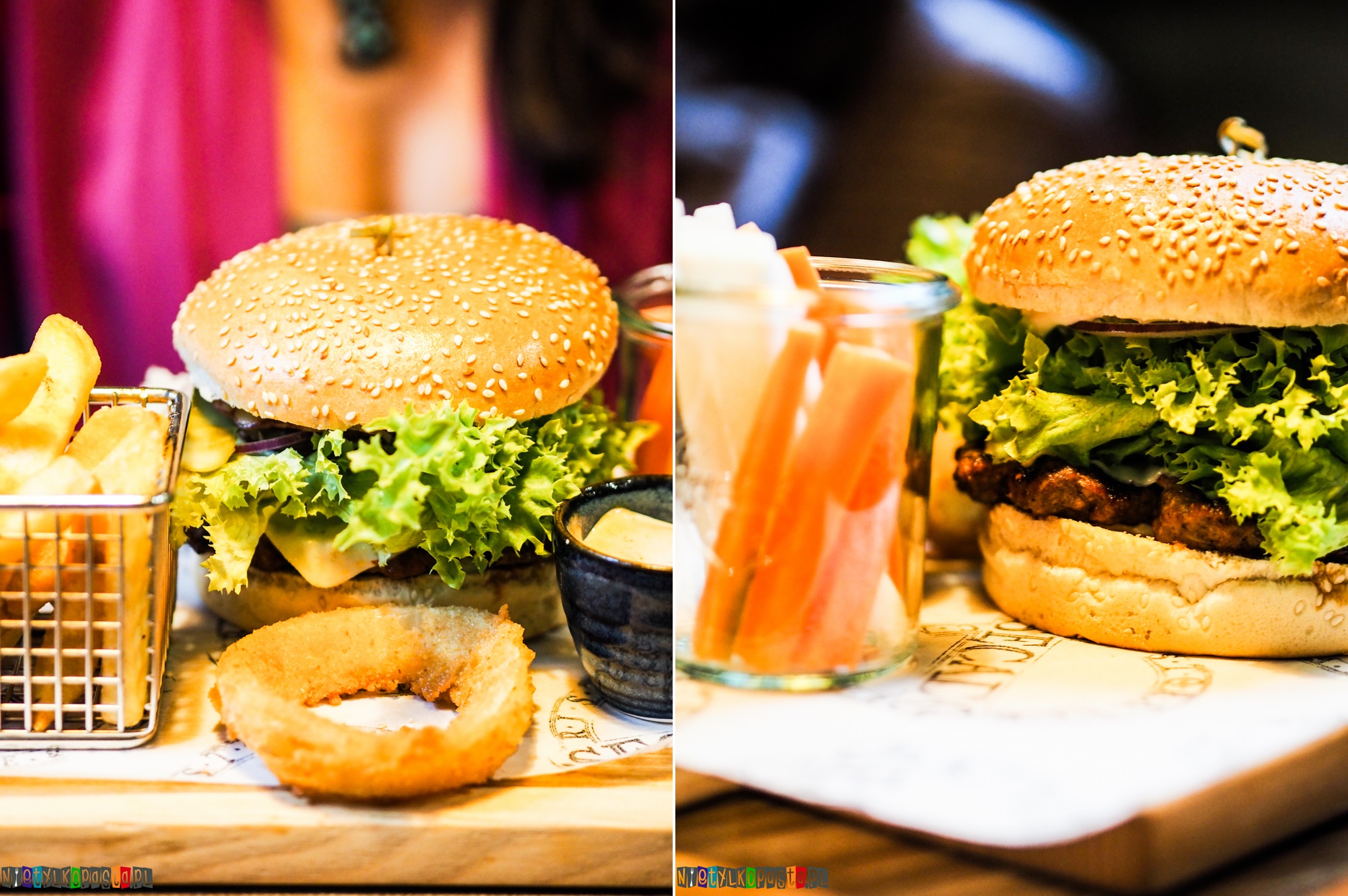 Mój burger okazał się być naprawdę wart polecenia. Pyszne mięso ze stopniem wysmażenia jaki sobie zażyczyłam, duża chrupiąca buka i mnóstwo dodatków takich jak: sos, frytki, krążki cebulowe, warzywa w słupkach do pochrupania. Ilość powalająca jak na moją skromną osobę. Jedynym naprawdę niedużym minusem była zbyt duża ilość sałaty w burgerze, która trochę zdominowała dodatki i której połowę zdecydowałam się porostu wyjąć ze środka. Ale sami przyznacie że taki minusik nie decyduje o całości 🙂