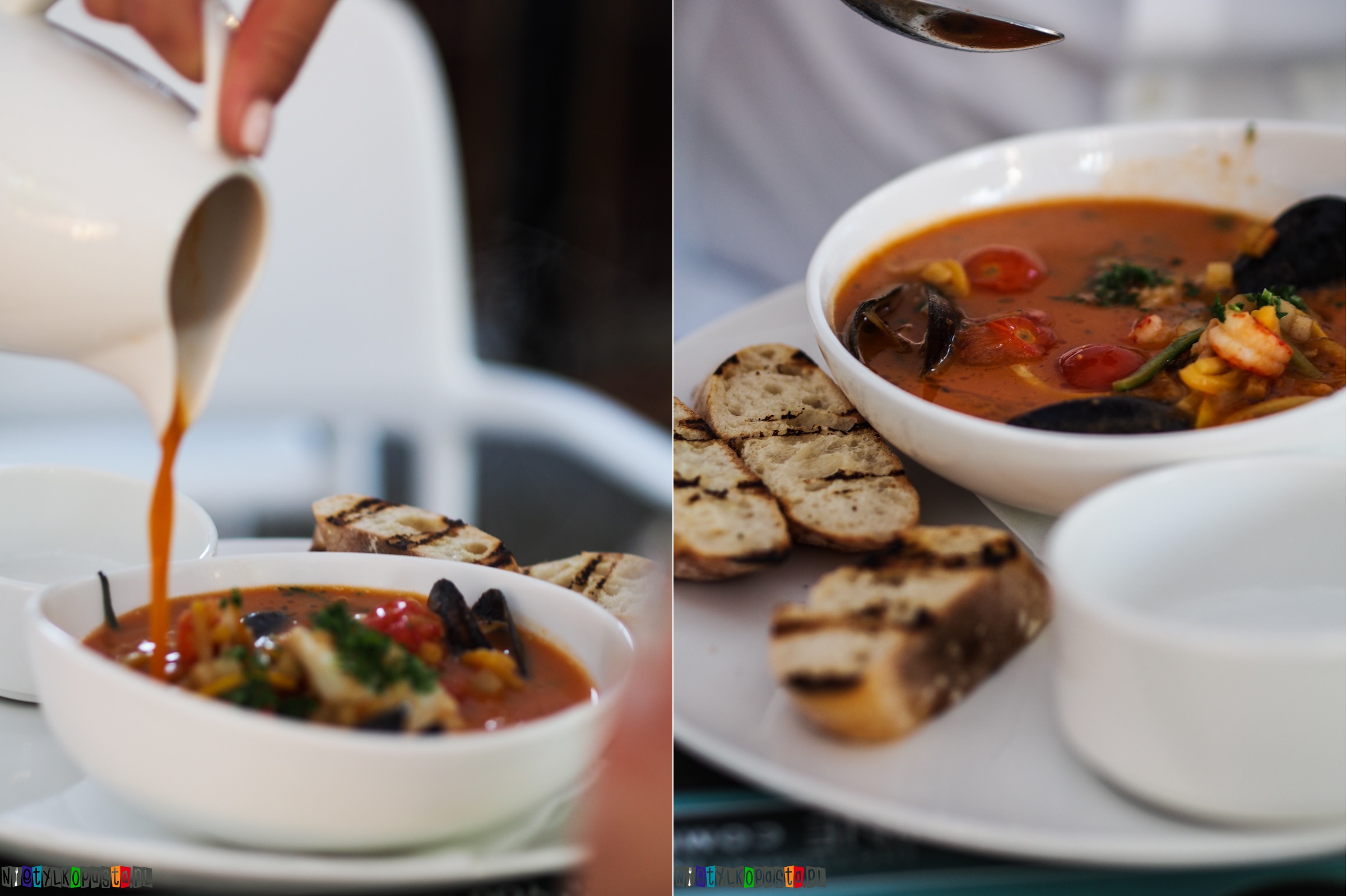 Ja z chęcią skusilabym się na to danie: Bouillabaisse z rakami / Mule / Halibut / Czosnek / Pomidory / Warzywa / Bagietka