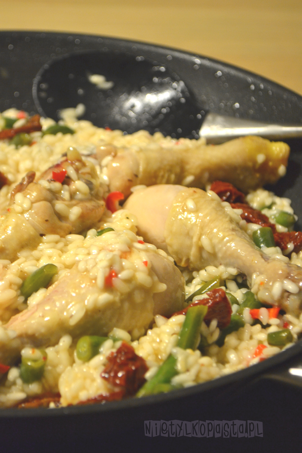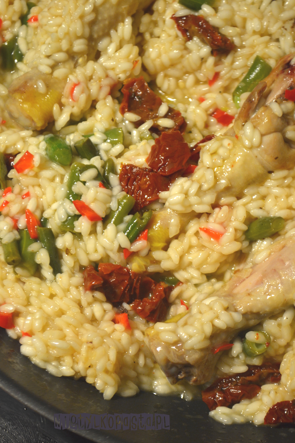 Risotto wymaga odrobiny uwagi, należy mieszać je i w razie potrzeby dodawać płynu. Na koniec ma mieć lekko kleistą konsystencję. W połowie gotowania dodajcie fasolkę, a 5 min przed końcem suszone pomidory.