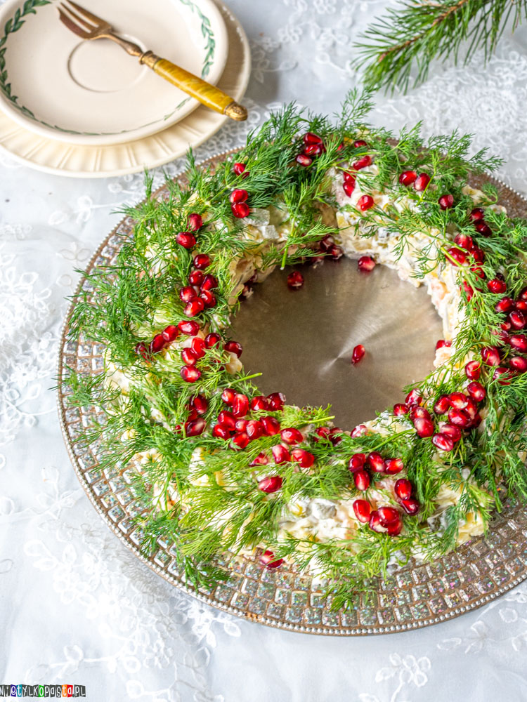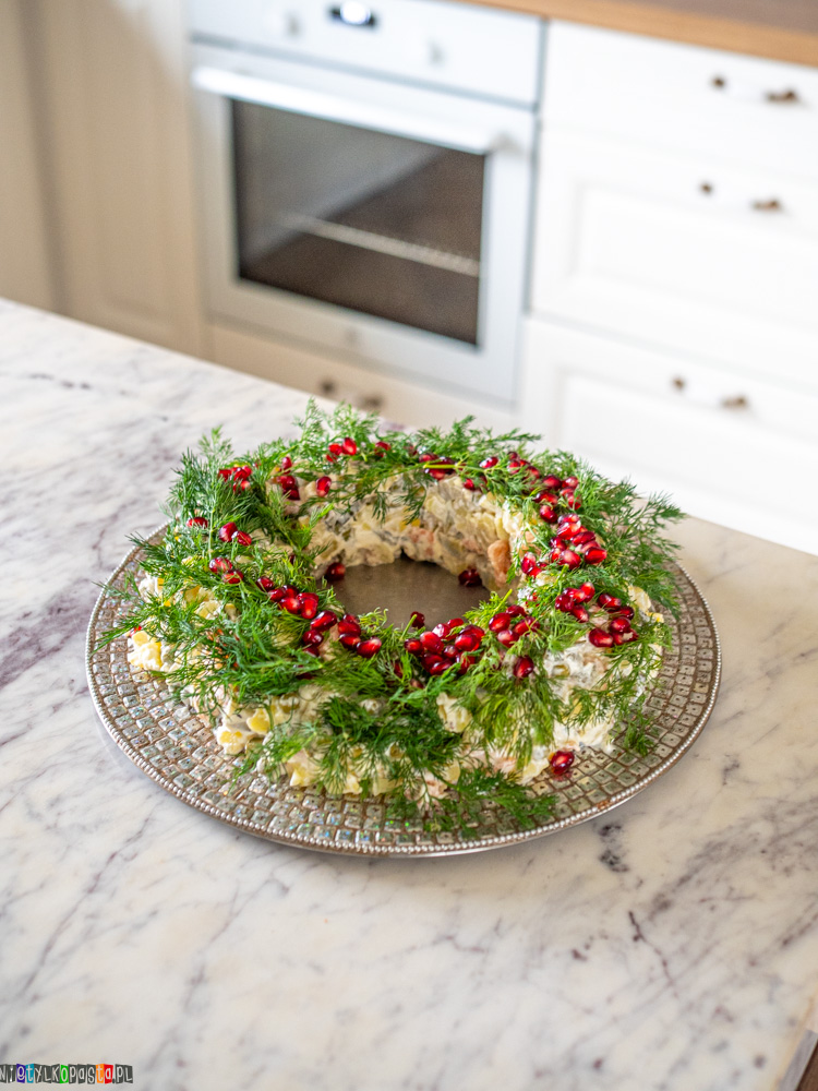 To także doskonała propozycja na imprezy, domówki i szczególnie na Sylwestra, kiedy zależy nam na efektownych, a jednocześnie prostych w przygotowaniu daniach. Sałatka pięknie prezentuje się na półmisku, zwłaszcza w formie wieńca udekorowanego koperkiem i pestkami granata, dzięki czemu staje się prawdziwą ozdobą stołu. Można przygotować ją wcześniej i schłodzić, co jest ogromnym plusem przy organizacji przyjęcia – przed podaniem wystarczy ją wyjąć z lodówki i podać gościom.