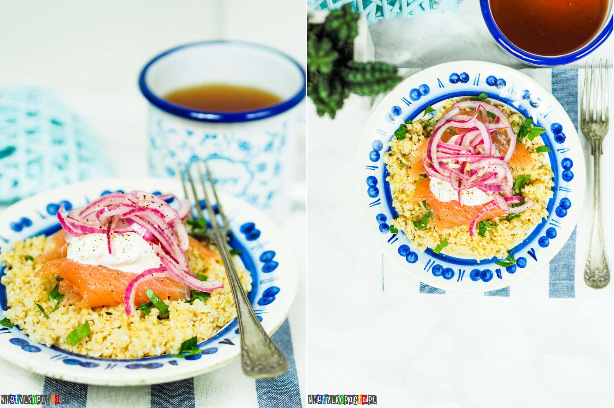 Na talerzu połóżcie kaszę wymieszaną z natką pietruszki drobno posiekaną. Polejcie sosem z oliwy. Na kaszę połóżcie łososia, śmietanę lub jogurt i odsączoną cebulę. Całość doprawcie pieprzem i podajcie.