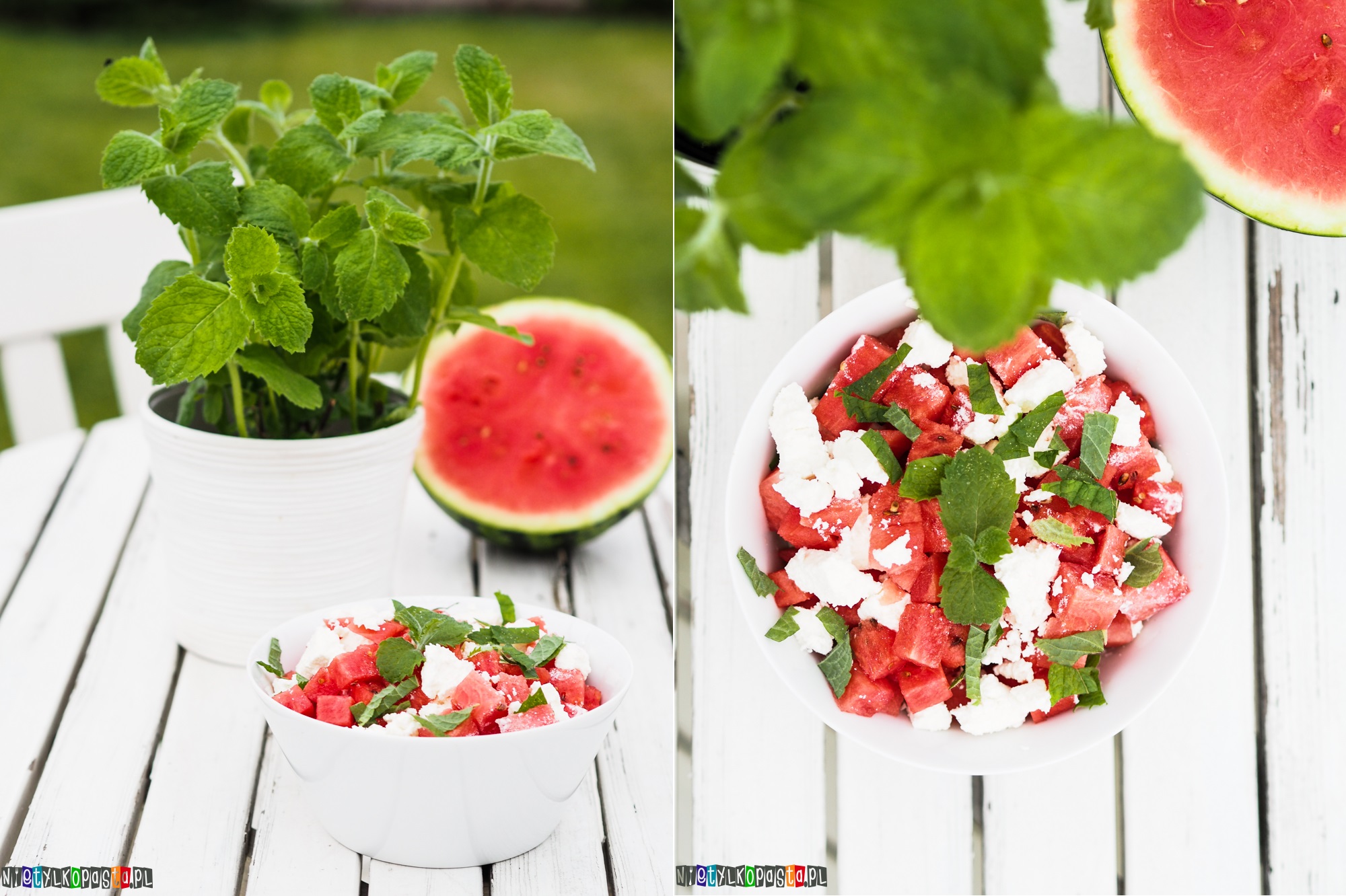 - Do arbuza dodajcie pokruszoną fetę oraz posiekane listki mięty. Podawajcie od razu lub po schłodzeniu w lodówce.