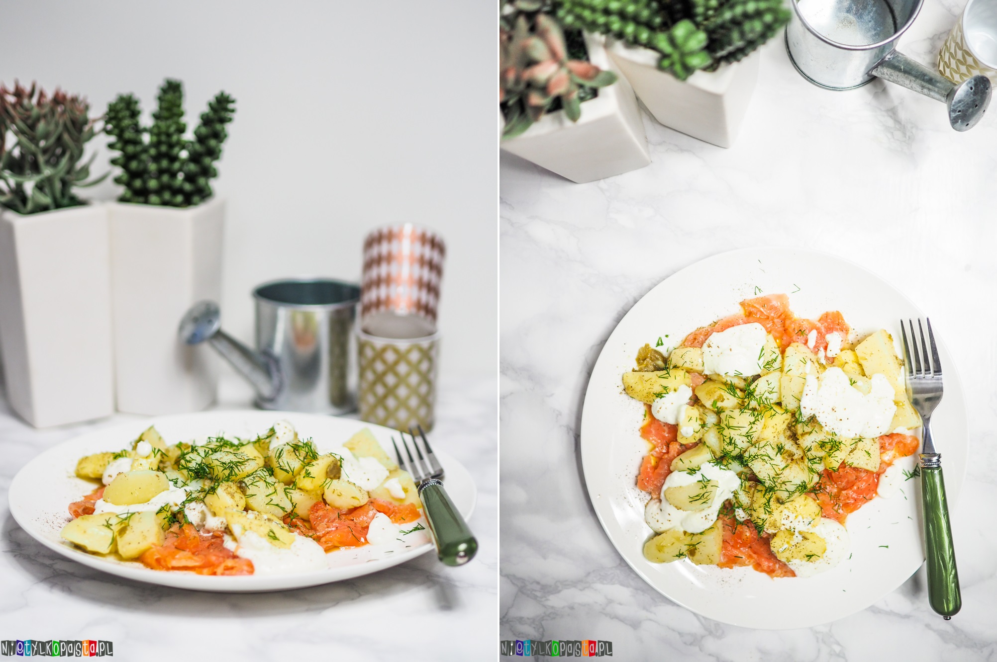 To jeden z lepszych przepisów na sałatki ziemniaczane jaki miałam okazję testować. Pyszny sos który przenika do ziemniaków, łosoś i sos śmietanowy z chrzanem stanowi pyszne połączenie smaków. Polecam tą sałatkę szczególnie na kolację jako samodzielne danie. Jestem pewna że zrobicie ją nie raz!
