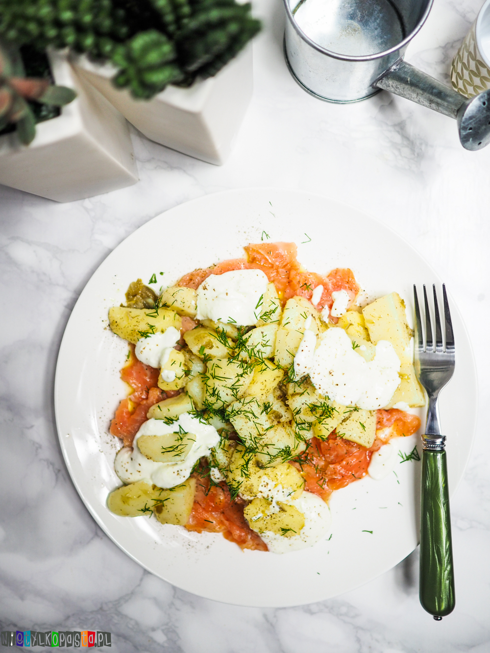 - Na talerzu połóżcie wędzonego łososia. Na rybę połóżcie ziemniaki z sosem, a następnie sos ze śmietany z chrzanem (wystarczy wymieszać wcześniej). Dodajcie świeżo mielony pieprz i gotowe.