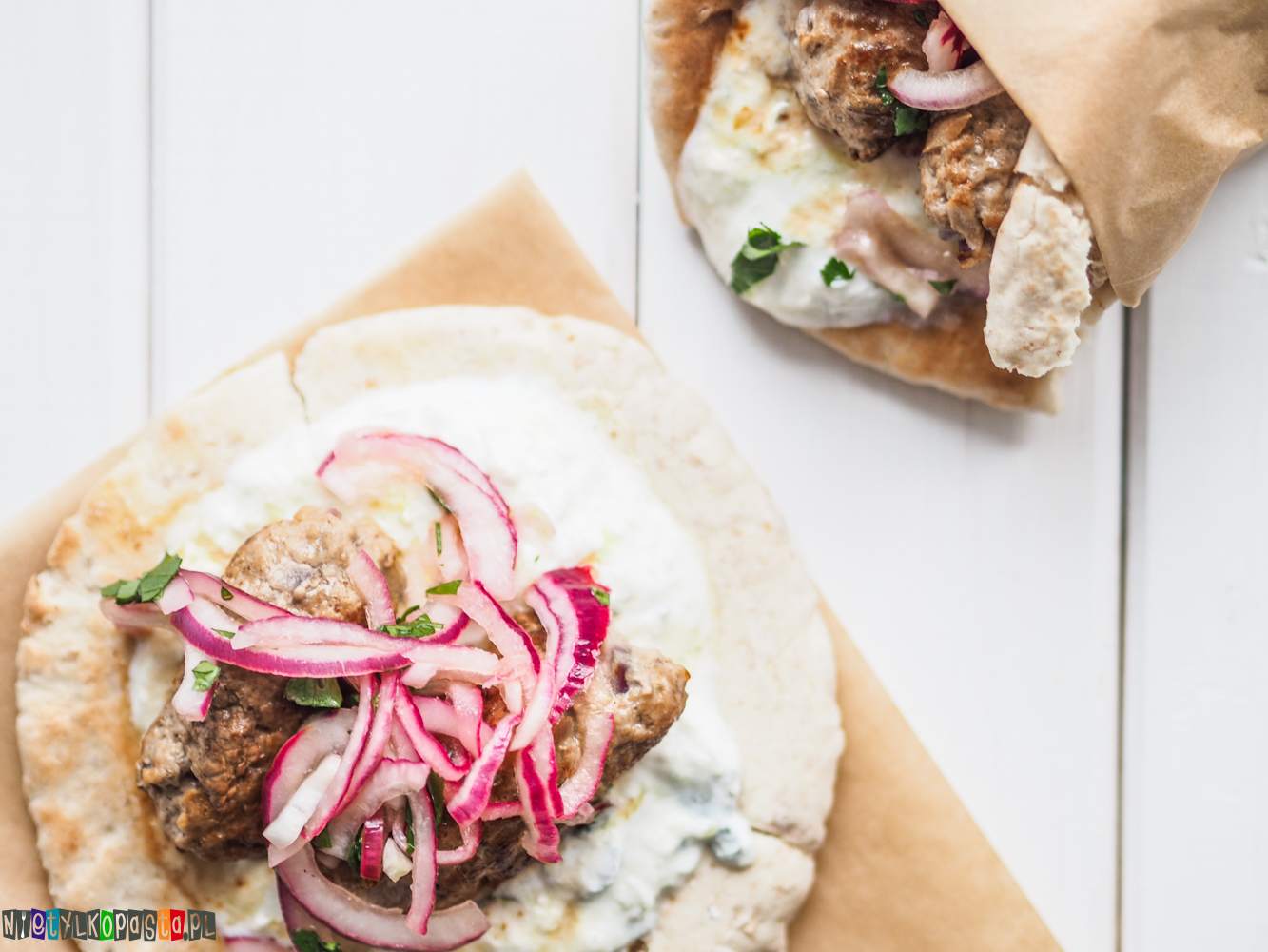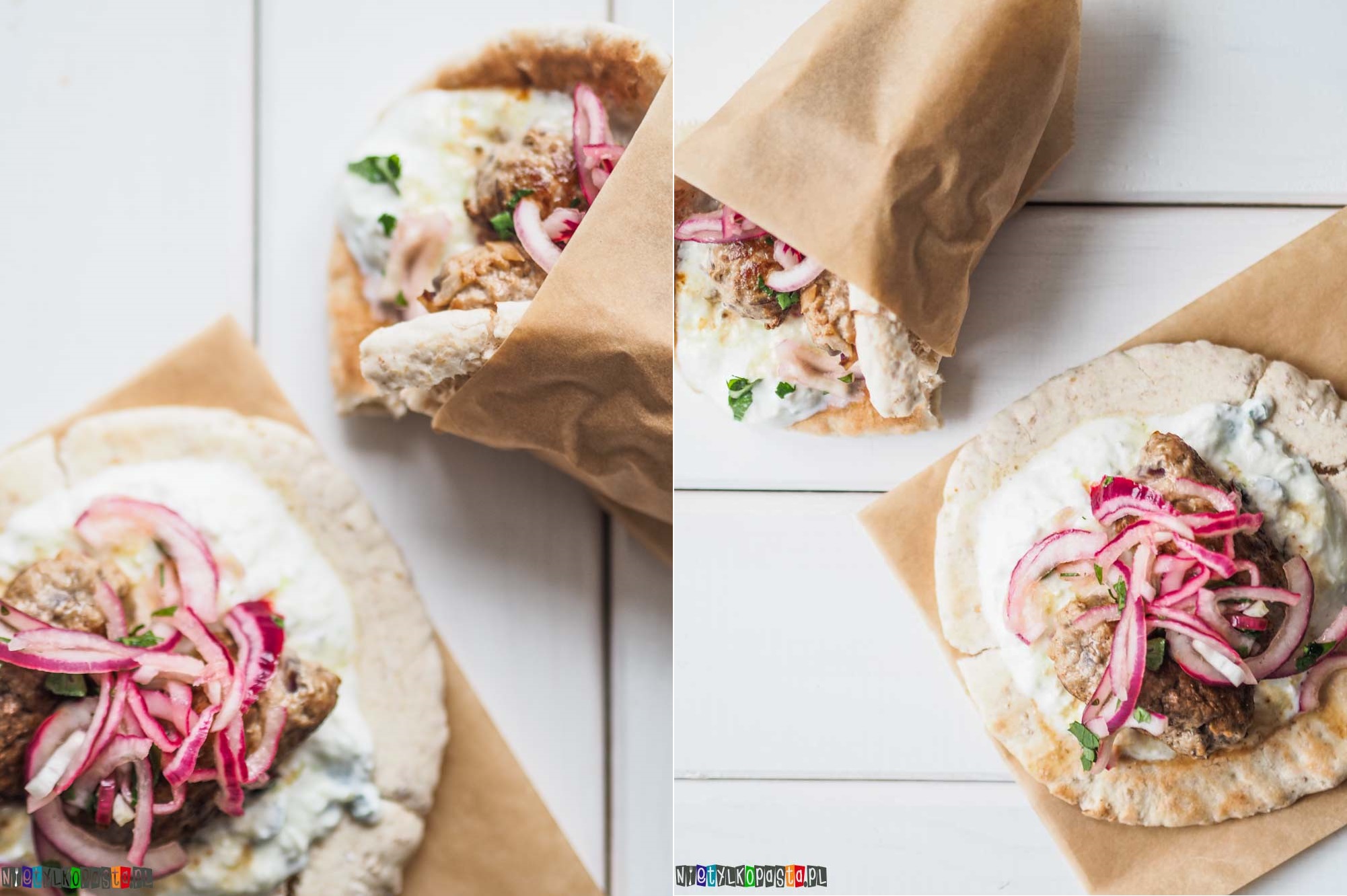 - Chlebki pita delikatnie zmoczcie wodą za pomocą kuchennego pędzla, podpieczcie na suchej patelni lub w nagrzanym piekarniku. Na tak przygotowaną pitę połóżcie trochę sosu tzatziki, 2 kotleciki i odrobinę cebuli. Zawińcie rożek i zjadajcie od razu puki wszystko jest ciepłe 🙂