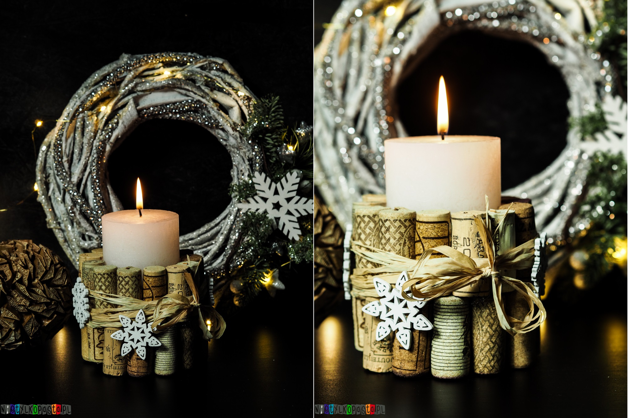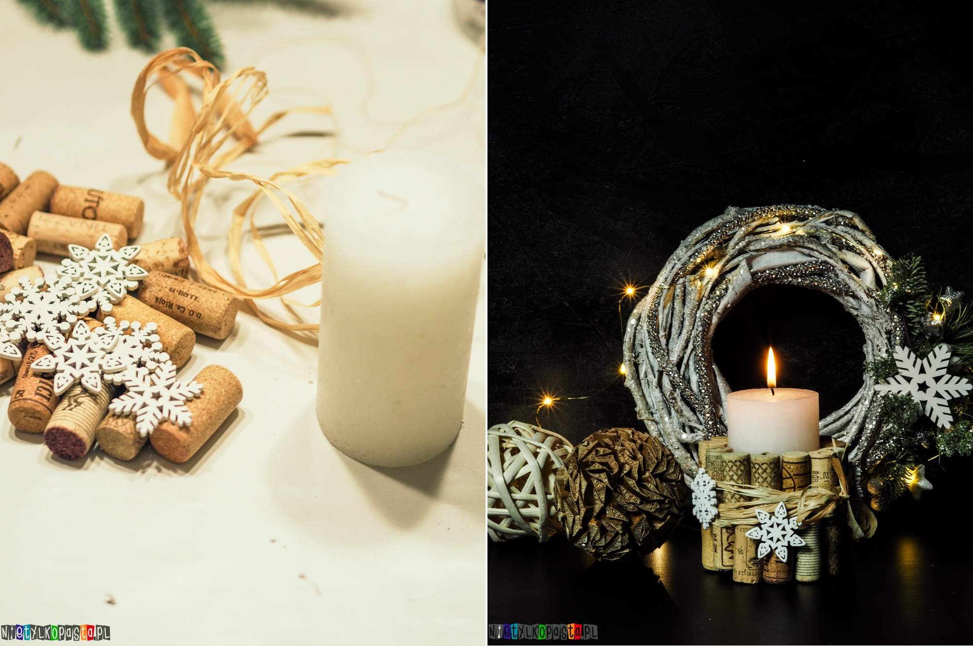 Korki przyklejacie do świecy za pomocą kleju. Ja wybrałam pistolet i klej na gorąco. Po przyklejeniu wszystkich obwiązujecie korki rafią lub dowolną wstążką i doklejacie dodatkowe ozdoby.