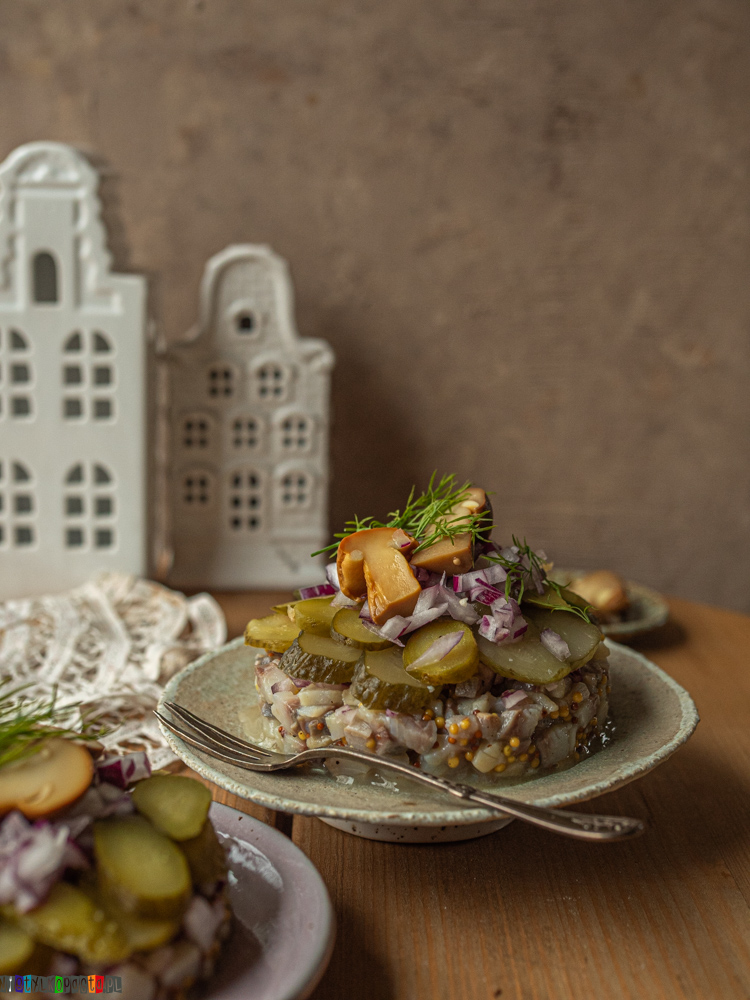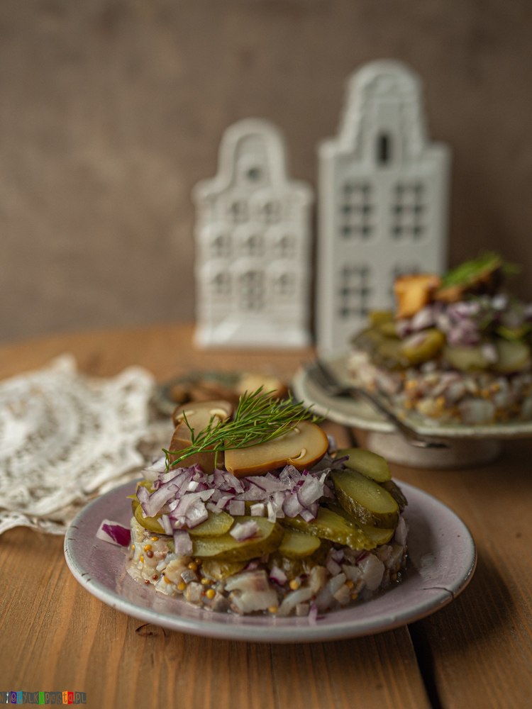 – dodatki do podawania: kiszone ogórki, korniszony, cebula czerwona, opcjonalnie ta gotowa z opakowania śledzi, inne dodatki takie jak kapary, marynowane grzyby, kiełki słonecznika