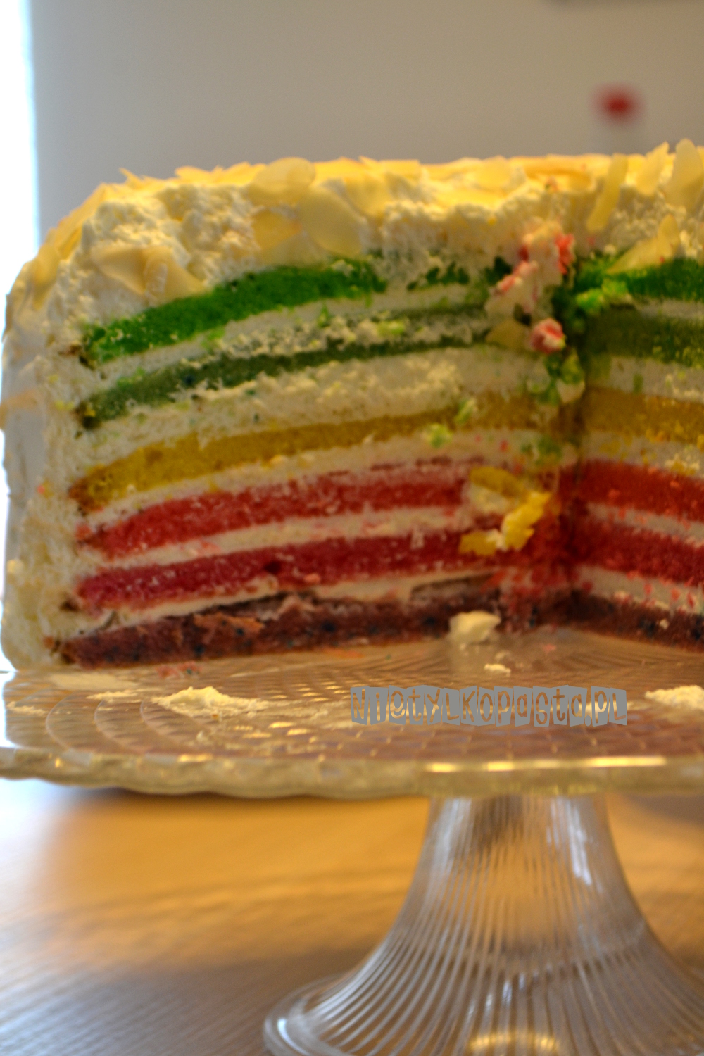 Już od dawna myślałam o tym torcie. Po przepis sięgnęłam na bloga Moje Wypieki. Zmieniła tylko nieco kolorystykę mojego wypieku – więcej wiosennej zieleni a w dodatku różowy. Ale kolory możecie dobrać dowolne!