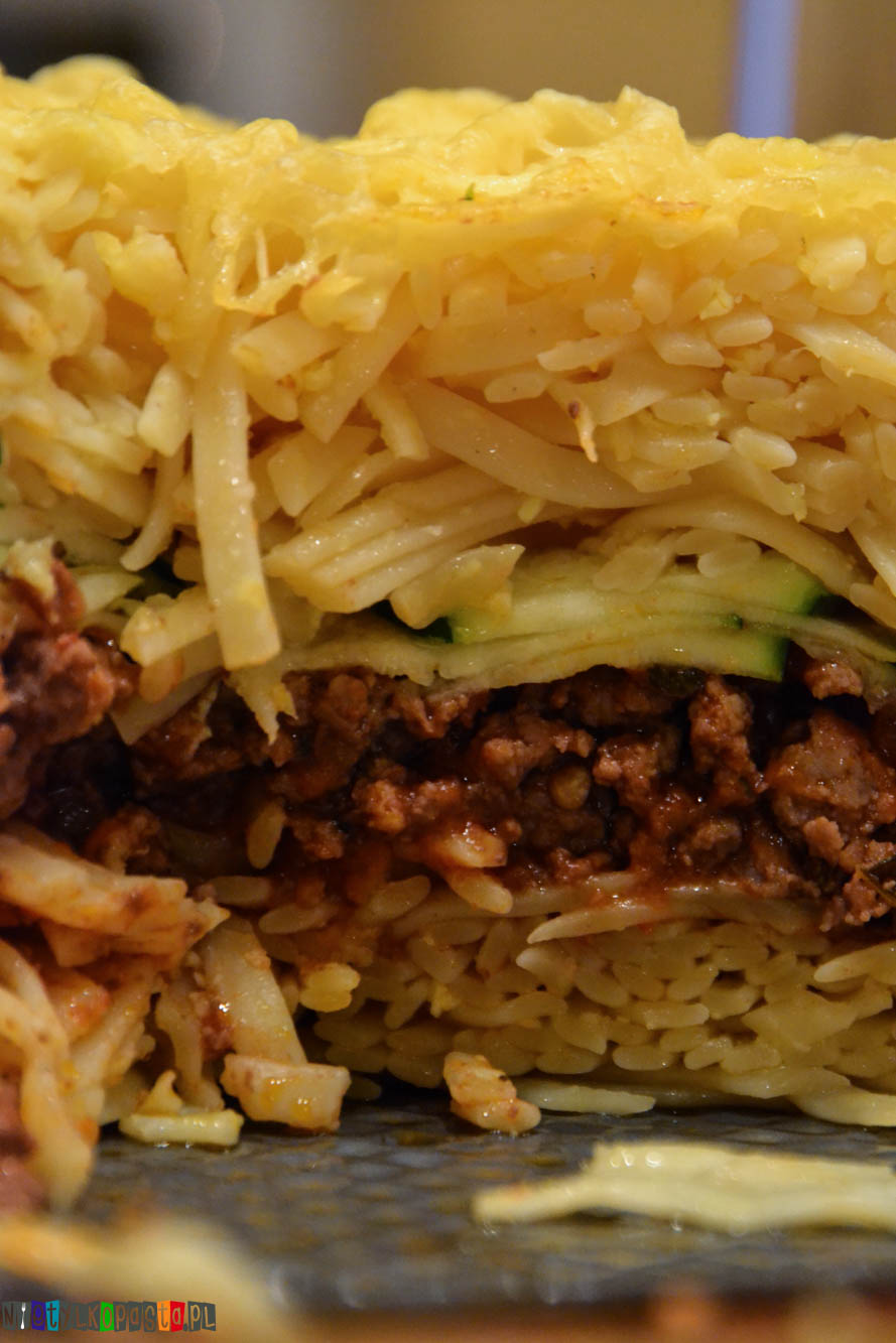 Nałóżcie na dno okrągłej formy do tortów makaron, ugniatając go lekko. Na makaron wyłóżcie mięso, jednak tak aby brzegi pozostały puste. Nałóżcie plasterki cukinii a następnie resztę makaronu. Włóżcie do piekarnika przykrywając kawałkiem folii aluminiowej i zapiekajcie ok 20 min. Następnie odkryjcie, posypcie pozostałym żółtym serem i zapiekajcie do jego rozpuszczenia i zezłocenia.