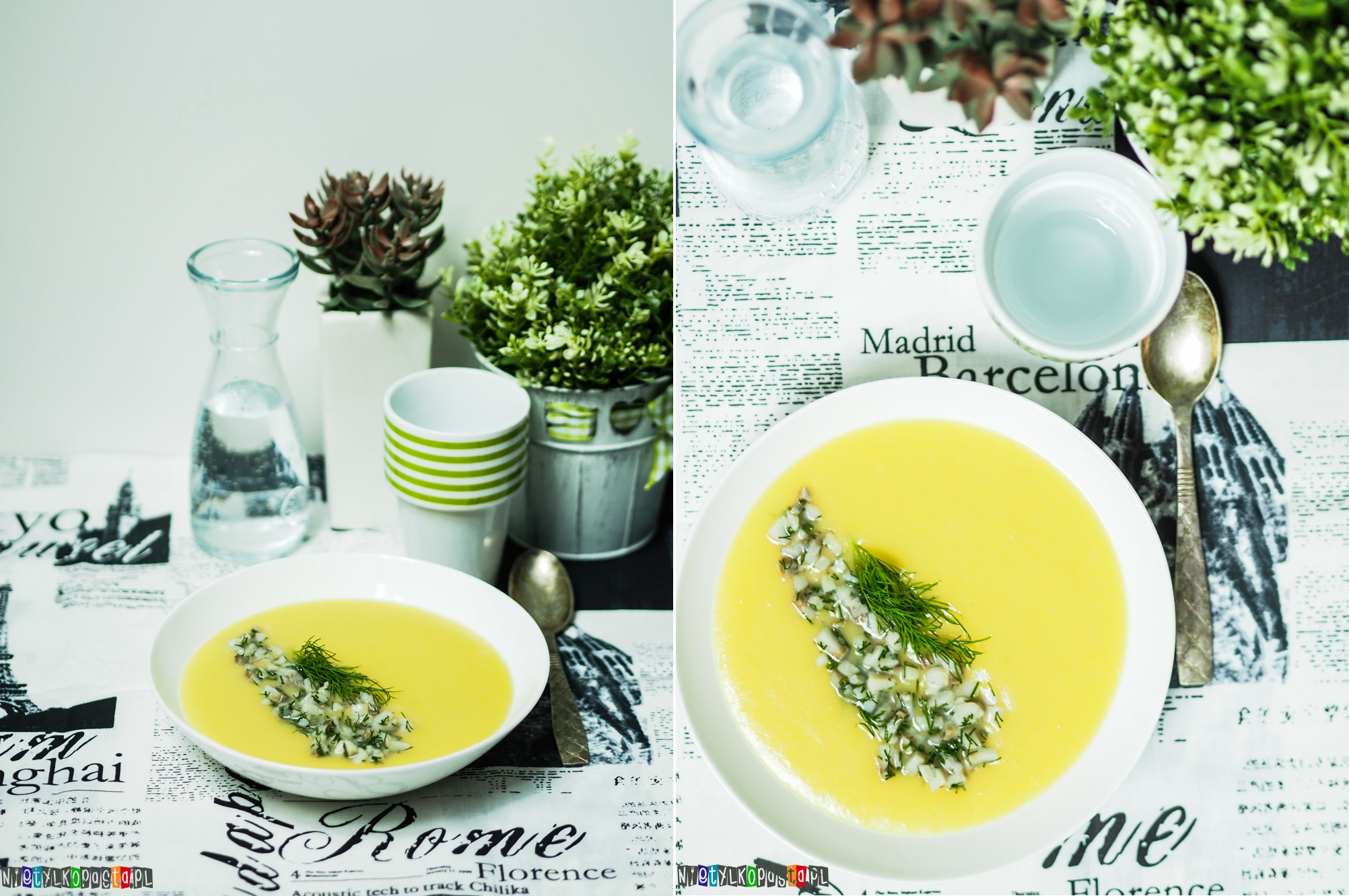 Śledzia pokrójcie w bardzo drobną kostkę i wymieszajcie z posiekanym koperkiem. Wlejcie zupę do misek i udekorujcie przygotowanym śledziem. SMACZNEGO!